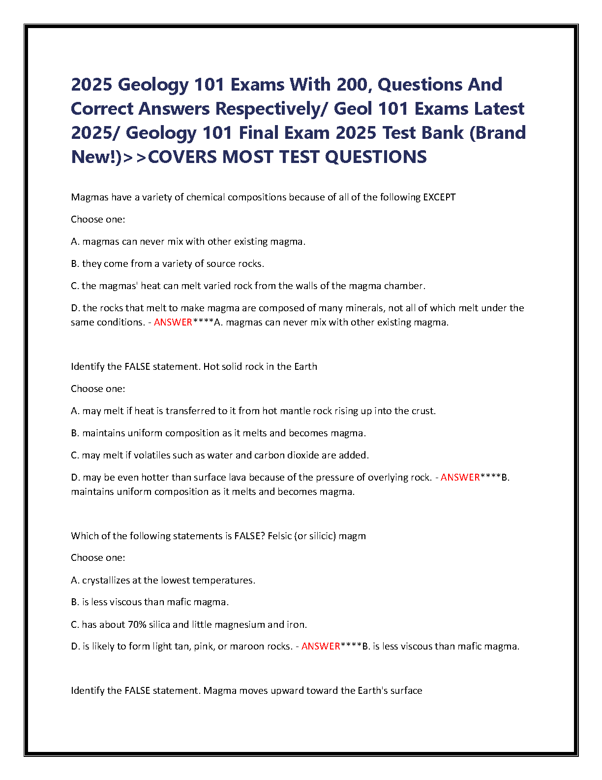 Conquer your Geology 101 exams with this comprehensive 2025 edition test bank, featuring 200 questions and detailed answers. This resource covers the most crucial exam topics and is designed to help students pass on their first attempt. Get ready to avoid resits and achieve exam success!
