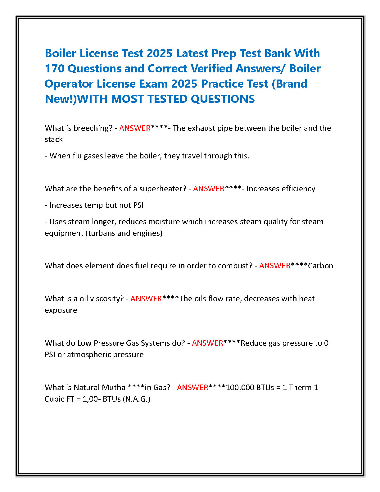 Ace your 2025 Boiler Operator License exam on the first try with this comprehensive prep test bank. 170 questions with verified answers cover the most tested topics, ensuring exam readiness and helping avoid costly resits. Get your copy today!