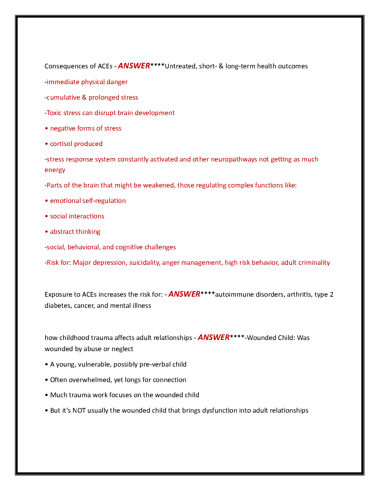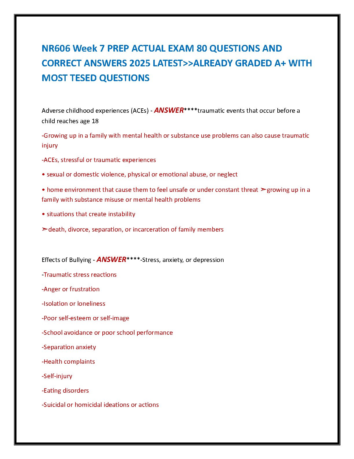 Get ahead with this comprehensive study guide for NR606 Week 7. This 2025 edition contains 80 actual exam questions with correct answers, already graded A+, covering key topics like Adverse Childhood Experiences (ACEs) and the effects of bullying. Prepare effectively and avoid resits – pass your exam on your first try!