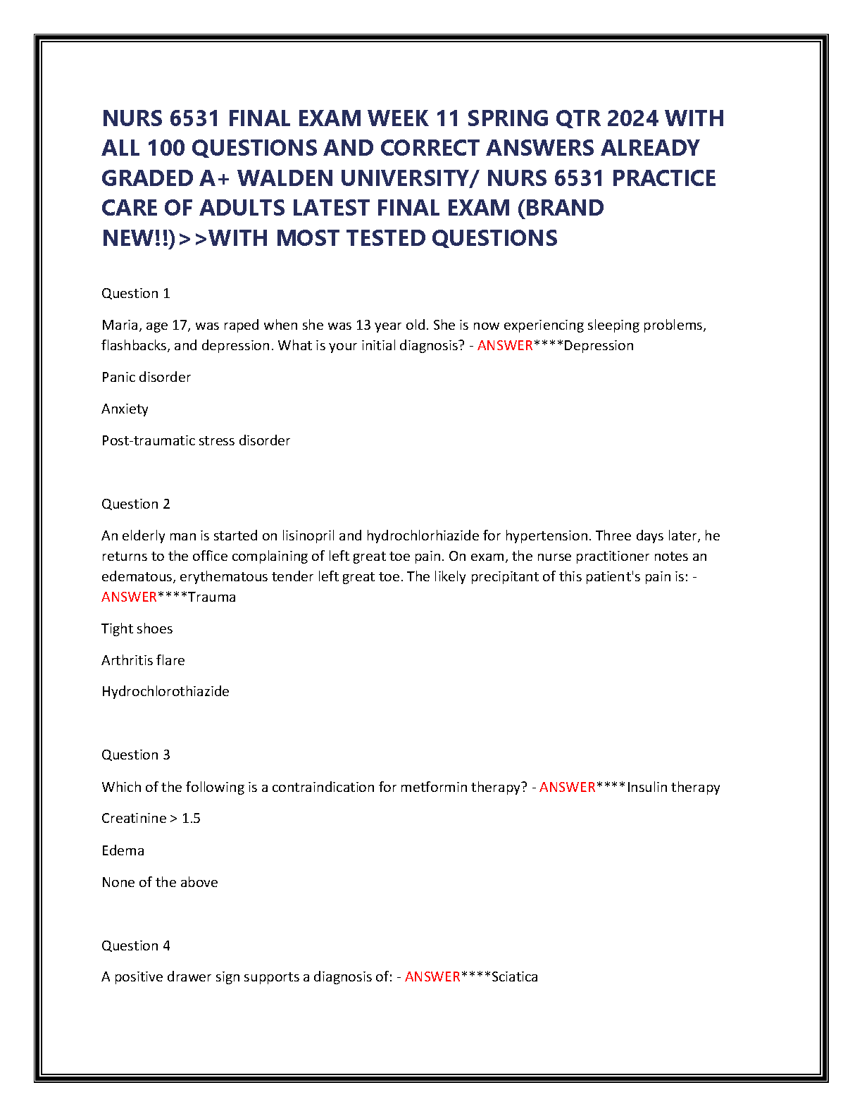 Ace your NURS 6531 final exam with this comprehensive study guide featuring 100+ questions and answers, covering key concepts in adult care. This 2024 edition ensures you're prepared for the latest exam content, boosting your chances of passing on the first try and avoiding resits. Ideal for Walden University students.