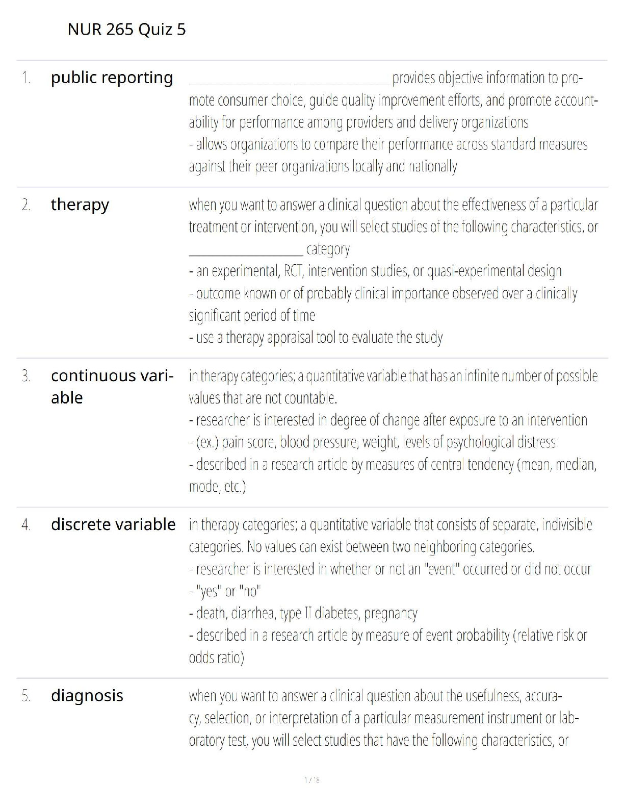 Conquer your NUR 265 exam with this expertly crafted study guide, designed to help you pass on your first attempt. This resource covers key concepts, including public reporting, therapy, continuous and discrete variables, and diagnostic testing, equipping you with the knowledge you need to succeed in your 2024/2025 academic year.