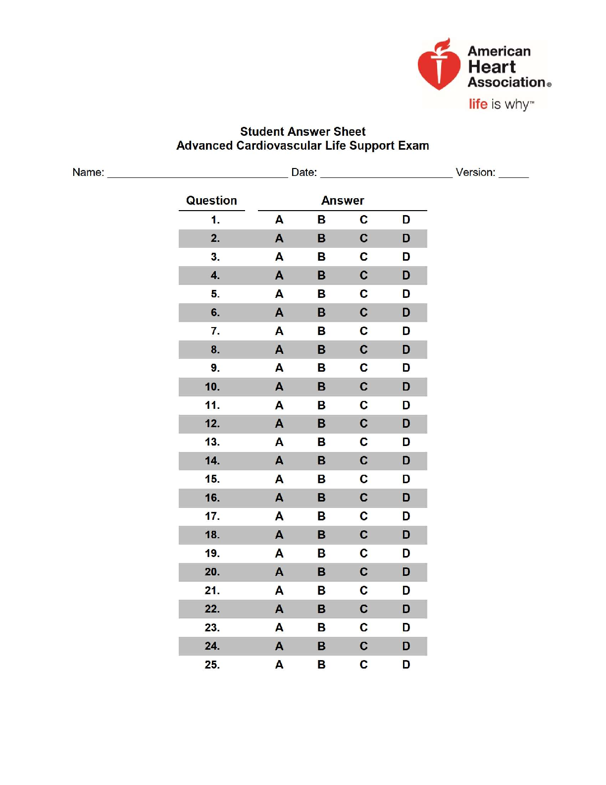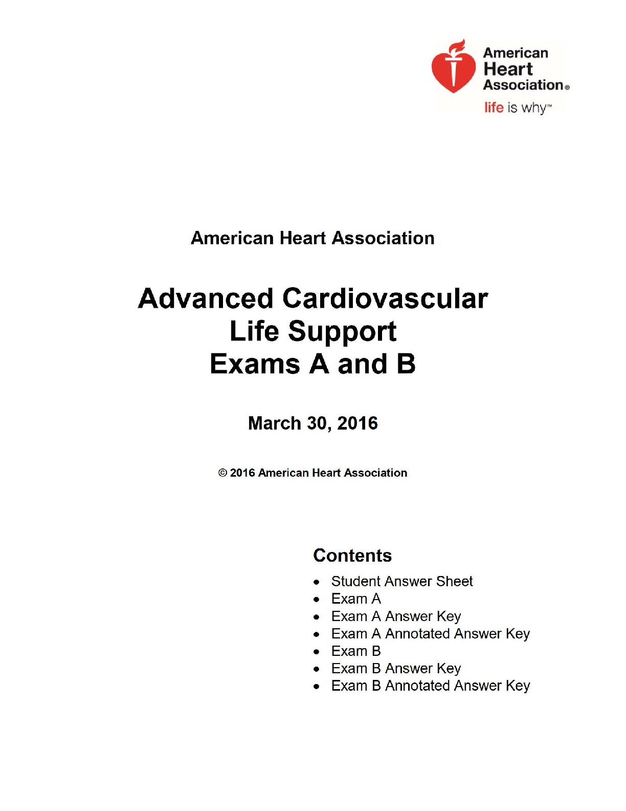 Ace your American Heart Association Advanced Cardiovascular Life Support (ACLS) Exams A and B with this comprehensive resource. This guide contains a student answer sheet and detailed answer keys for both Exam A and Exam B, including annotated versions for in-depth learning. Ensure exam success and avoid resits with this essential study aid.
