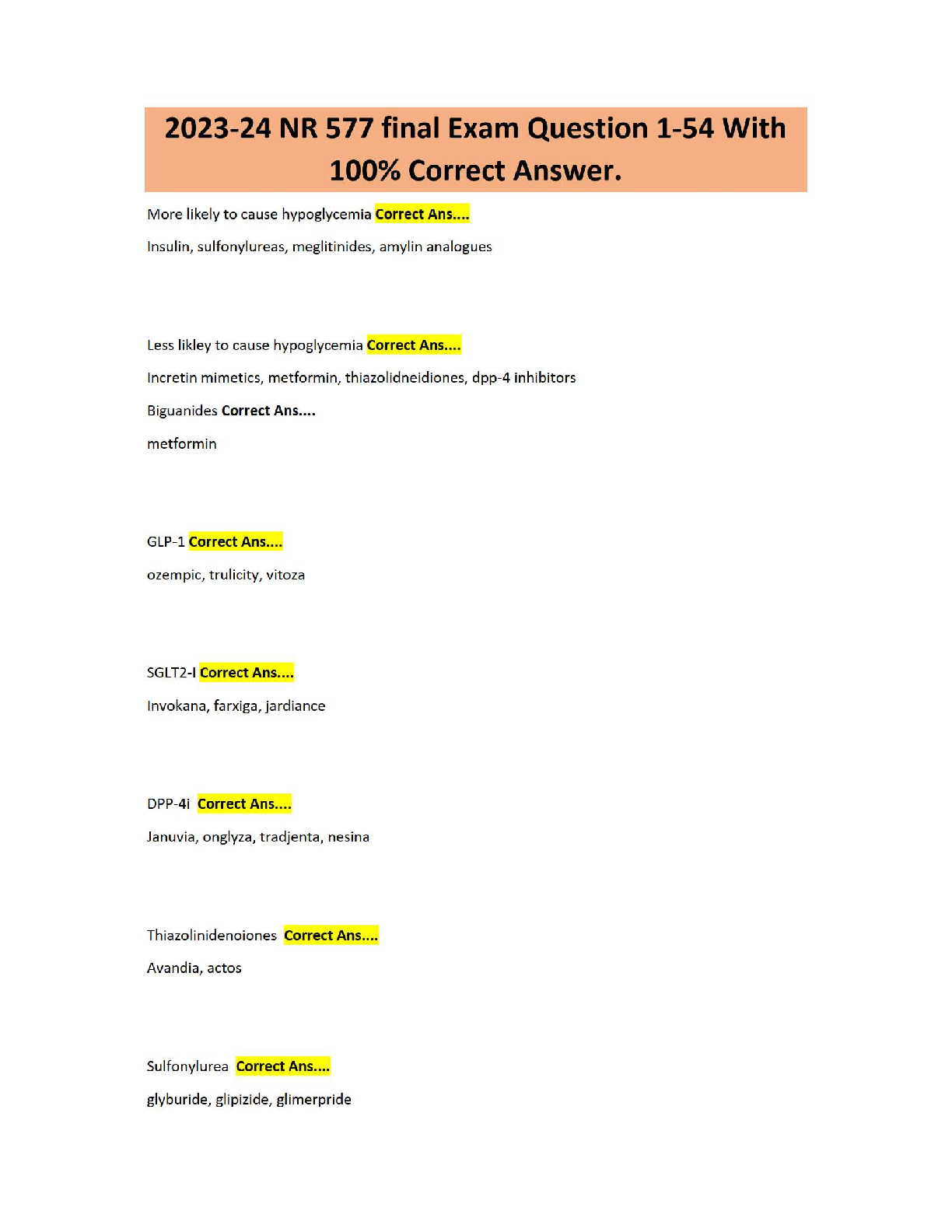 Ace your 2023-24 NR 577 final exam with this comprehensive question bank featuring 1-54 questions and answers. This resource is designed to help students achieve a perfect score and avoid exam resits. It covers key topics including hypoglycemia, various drug classes, and their associated medications. Ideal for first-time exam takers aiming for excellence.