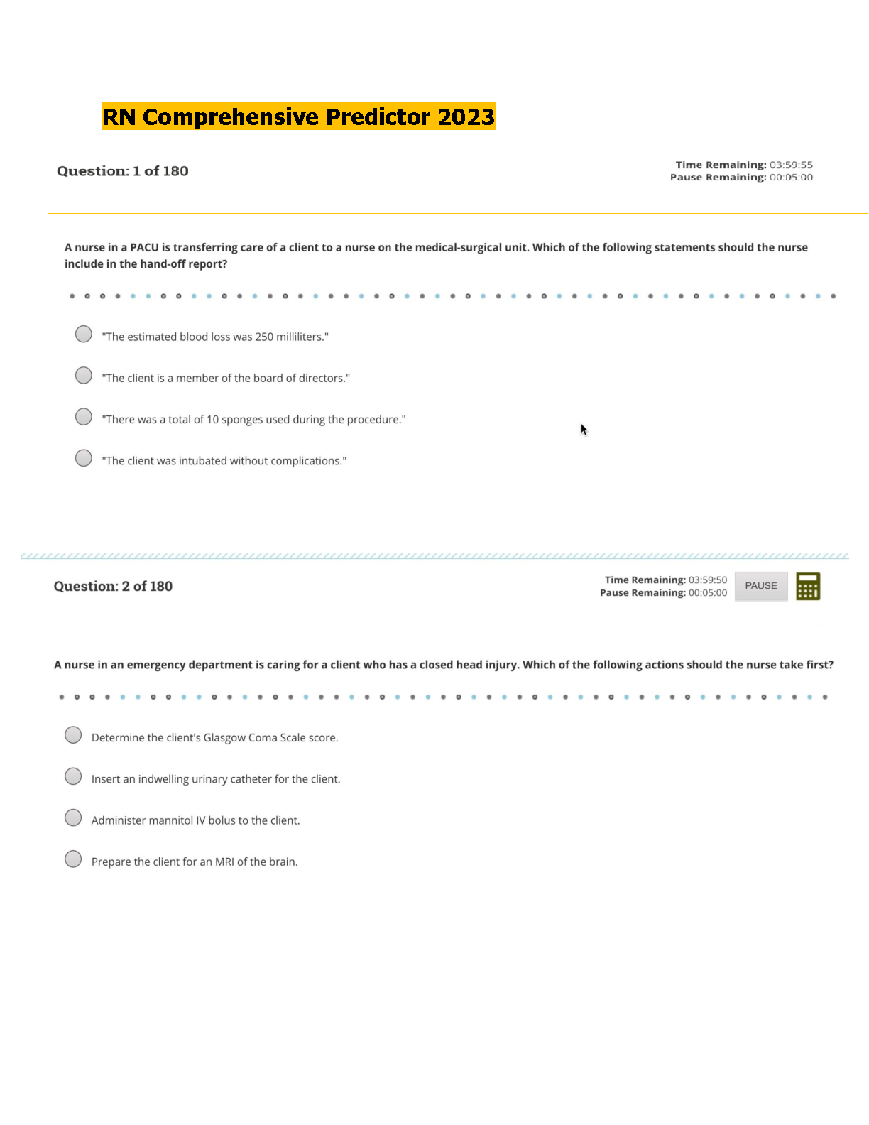 Prepare for your RN exam with confidence using this 2023 RN Comprehensive Predictor. This resource provides 180+ practice questions covering various nursing scenarios, ensuring you're well-prepared for exam day. Master key concepts and boost your score, maximizing your chances of passing on the first attempt. Ideal for 2024/2025 academic year.