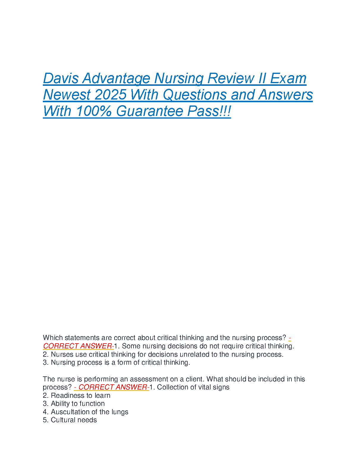 Davis Advantage Nursing Review II Exam 2025: Questions & Answers by Carolyn Jarvis, et al. - Ace Your Exam!