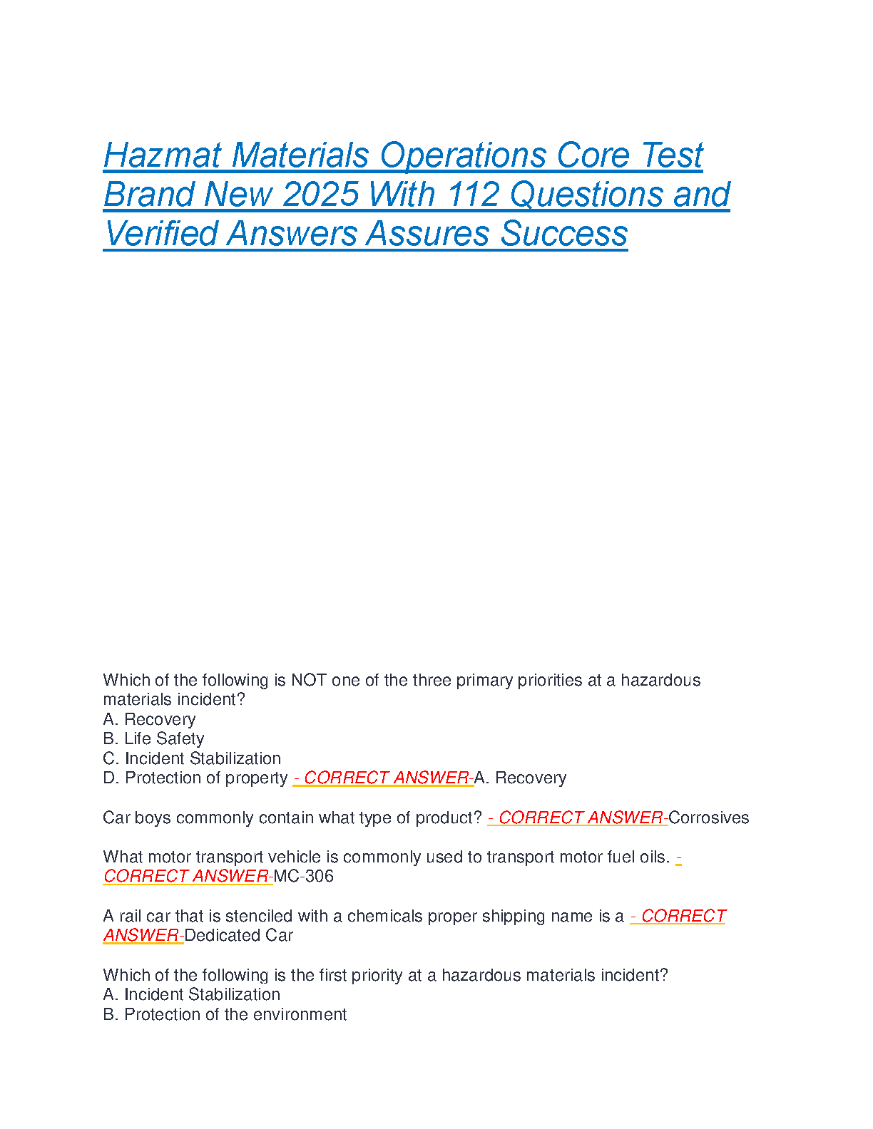 Pass your Hazmat Materials Operations Core Exam with flying colors using this brand new 2025 edition. This comprehensive test bank features 112 verified questions and answers, designed to help you avoid resits and succeed on your first attempt. Prepare effectively and confidently for exam day!