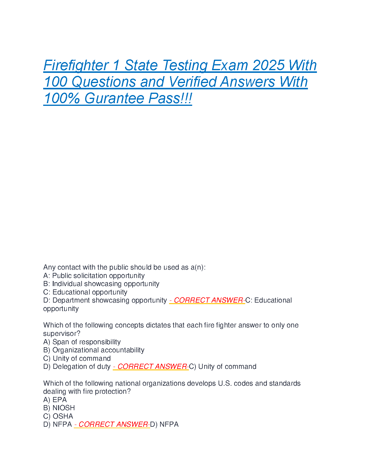 Ace your Firefighter 1 State Testing Exam in 2025 with this comprehensive study guide. This resource includes 100 verified questions and answers, designed to help you pass on your first try and avoid costly resits. Boost your confidence and master the key concepts for exam success.