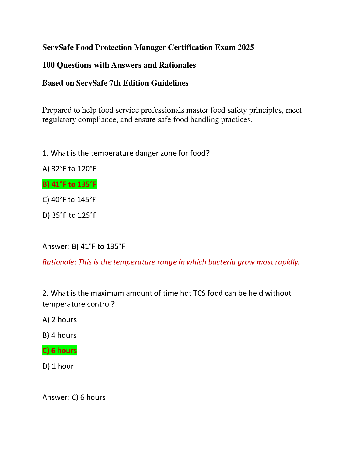 ServSafe Food Protection Manager Certification Exam 2025: 100 Questions with Answers and Rationales (7th Edition)