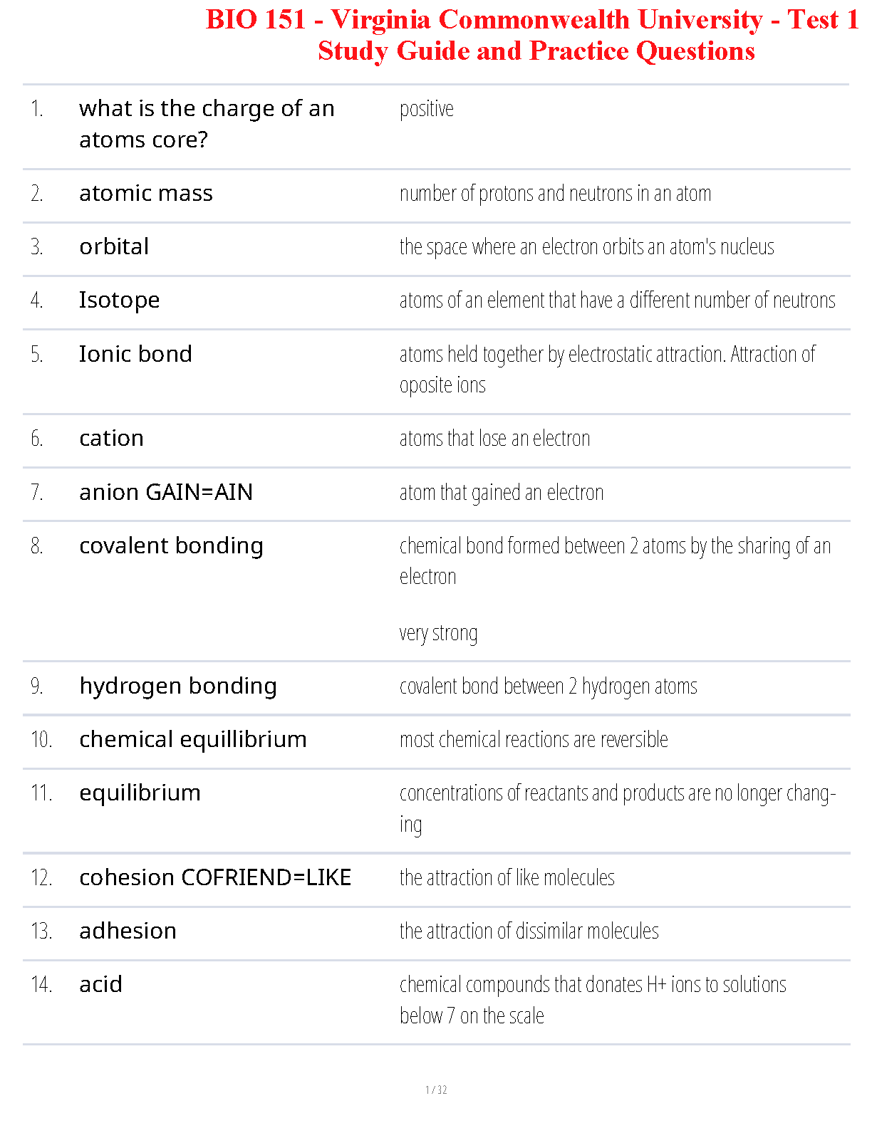 BIO 151 Virginia Commonwealth University Test 1 Study Guide and Practice Questions - 2024/2025 Edition