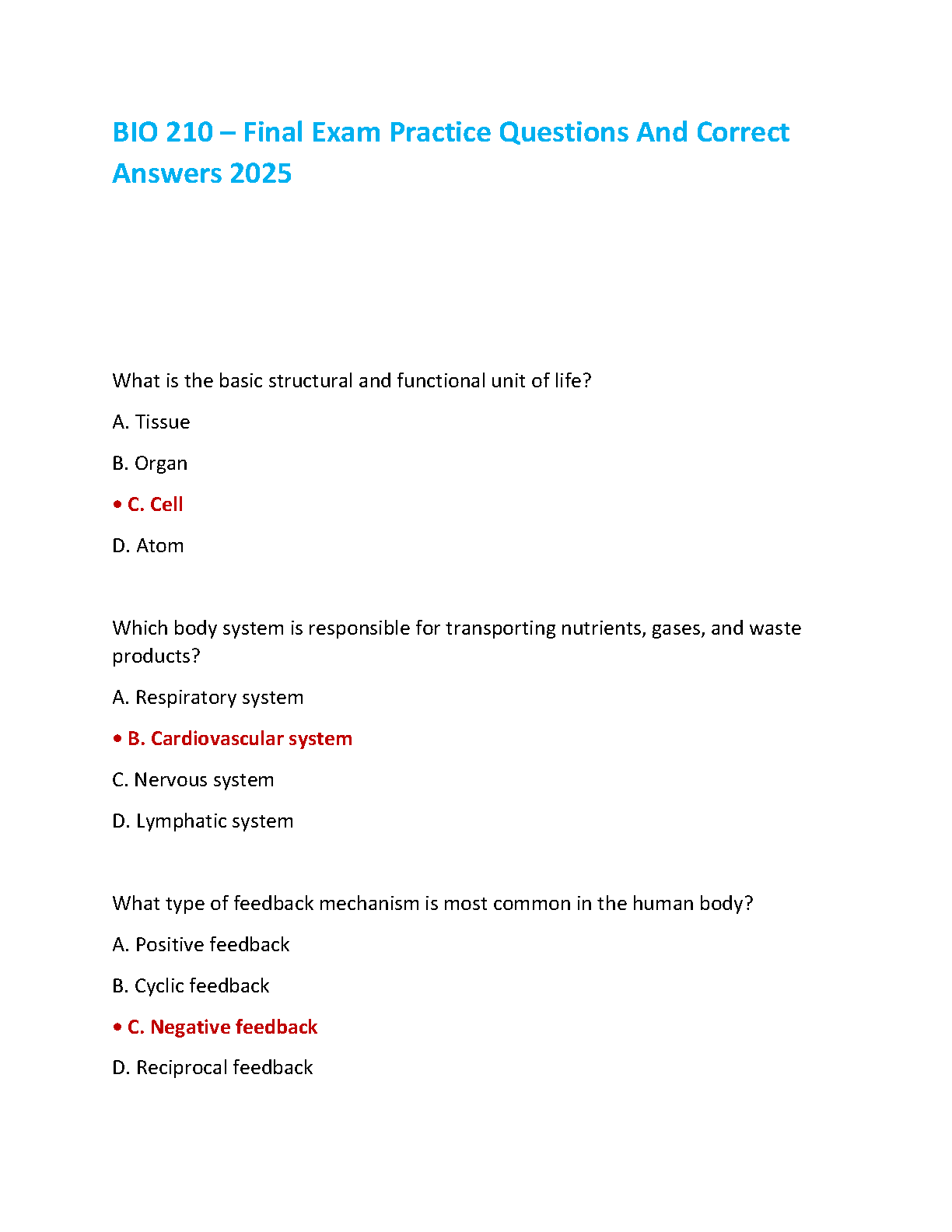 BIO 210 Final Exam Practice Questions and Answers 2025: Ace Your Exam on the First Try!