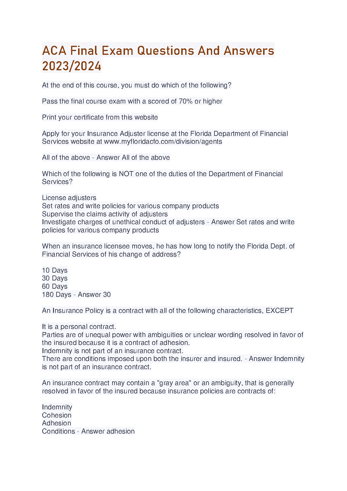 ACA Final Exam Questions and Answers 2023/2024 Edition