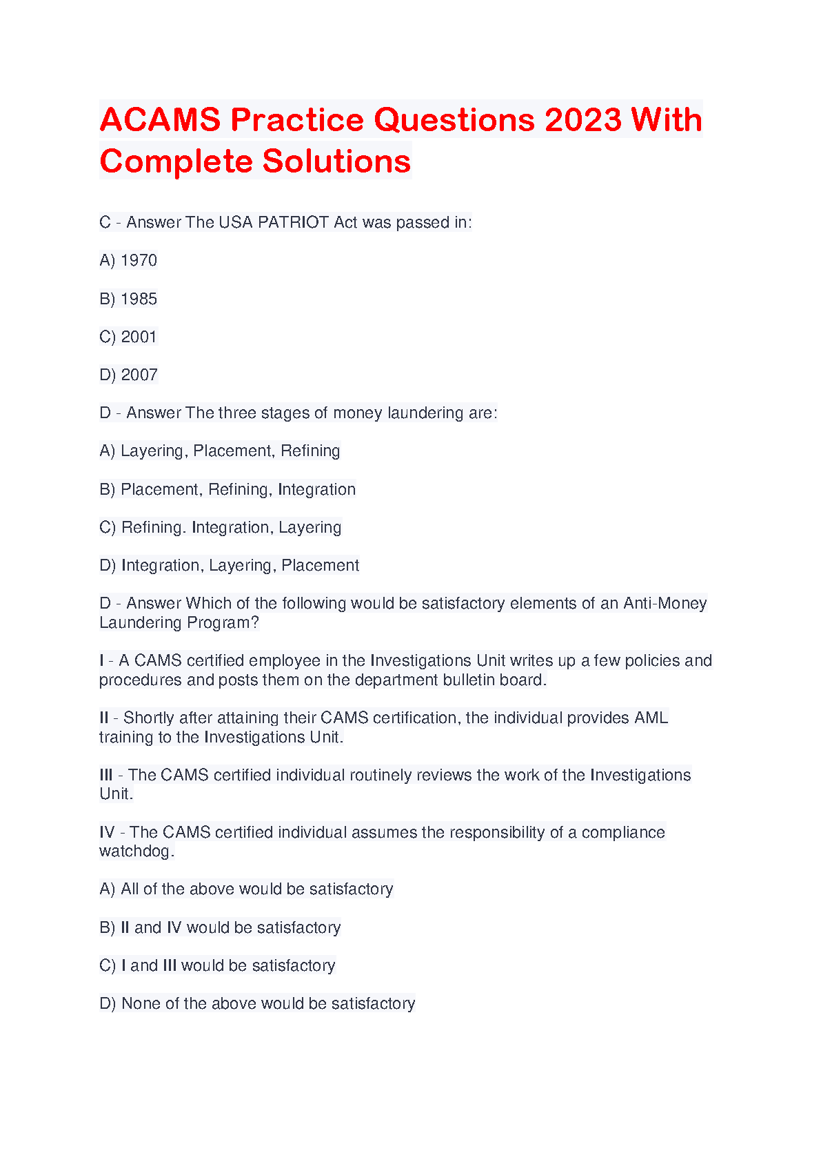ACAMS Practice Questions 2023 with Complete Solutions: A Comprehensive Guide for Exam Success