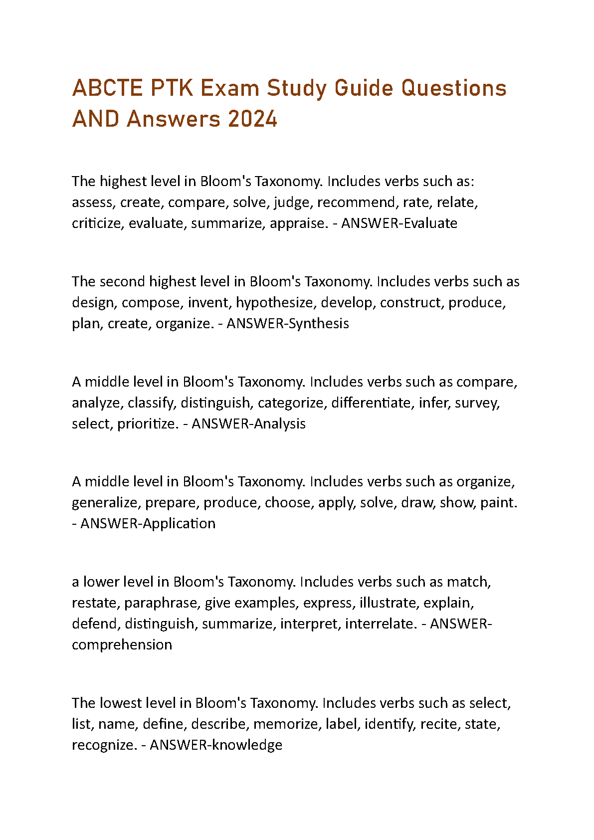 ABCTE PTK Exam Study Guide Questions and Answers 2024: A Comprehensive Guide to Bloom's Taxonomy for First-Time Passers
