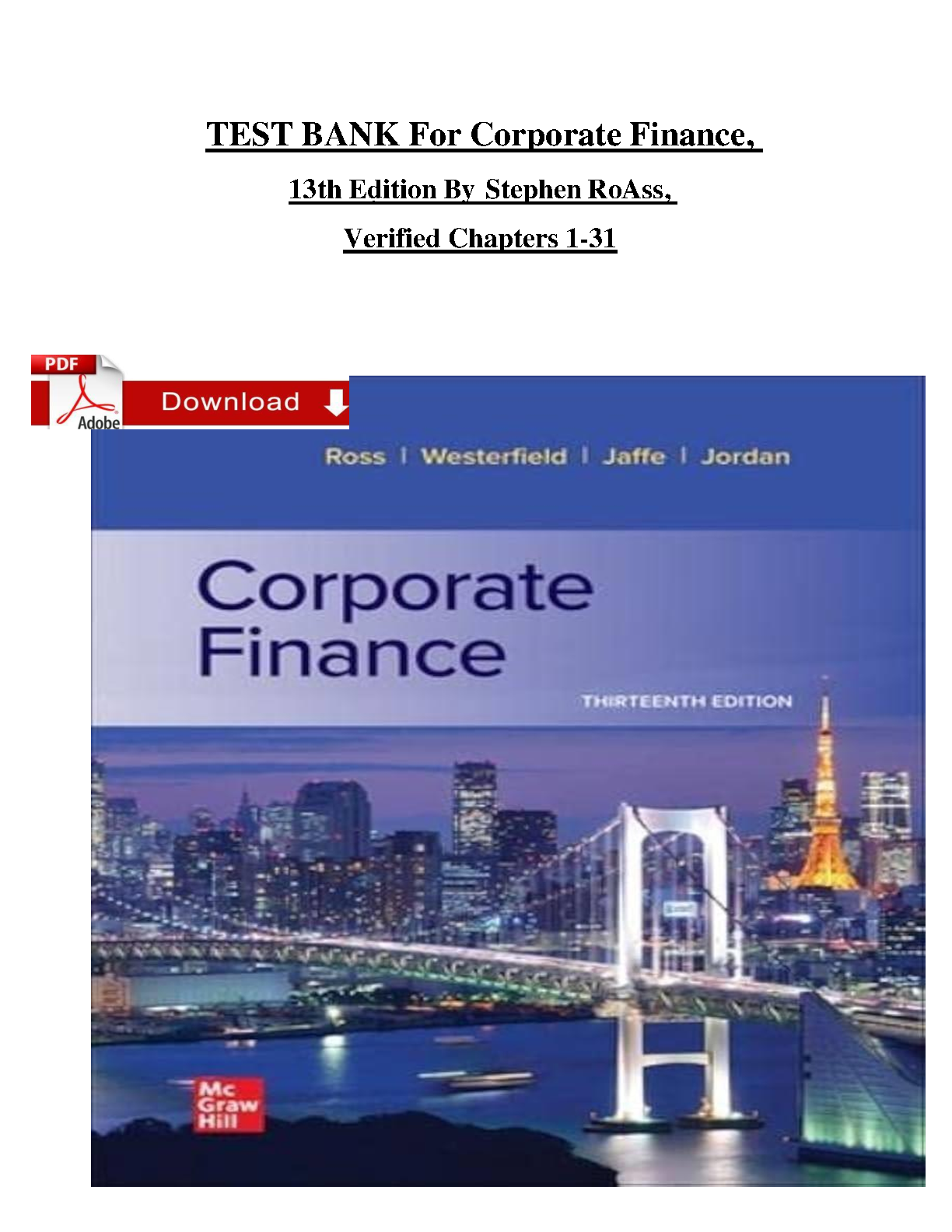 Ace your Corporate Finance exams with this comprehensive 13th edition test bank by Ross, Westerfield, Jordan, and Jaffe. Verified solutions for chapters 1-31 guarantee exam success on your first attempt, eliminating the need for resits. Download now and boost your academic performance.