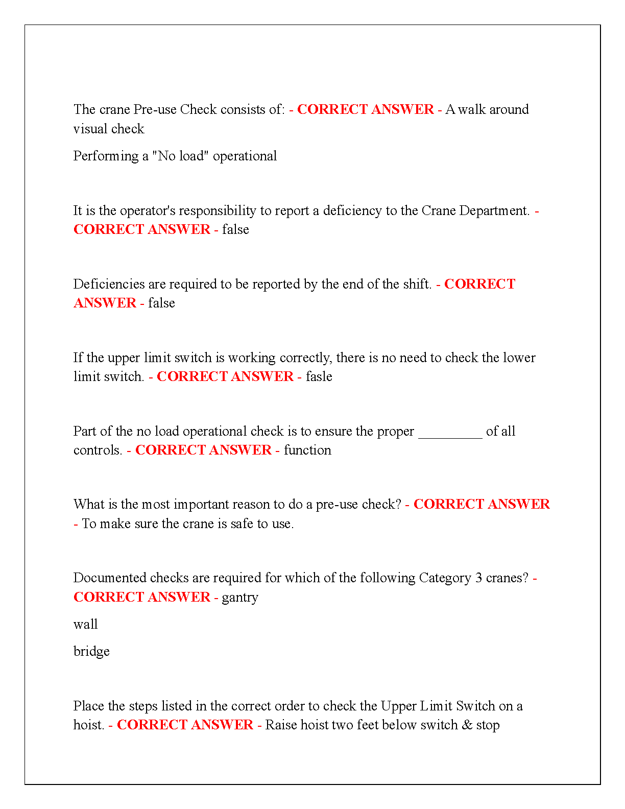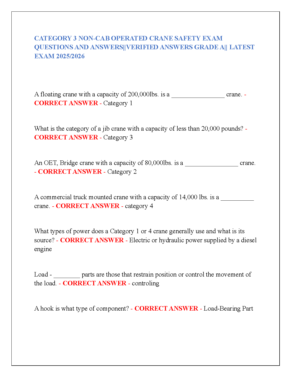 2024/2025 Category 3 Non-Cab Operated Crane Safety Exam Questions and Answers: Verified Answers for Grade A