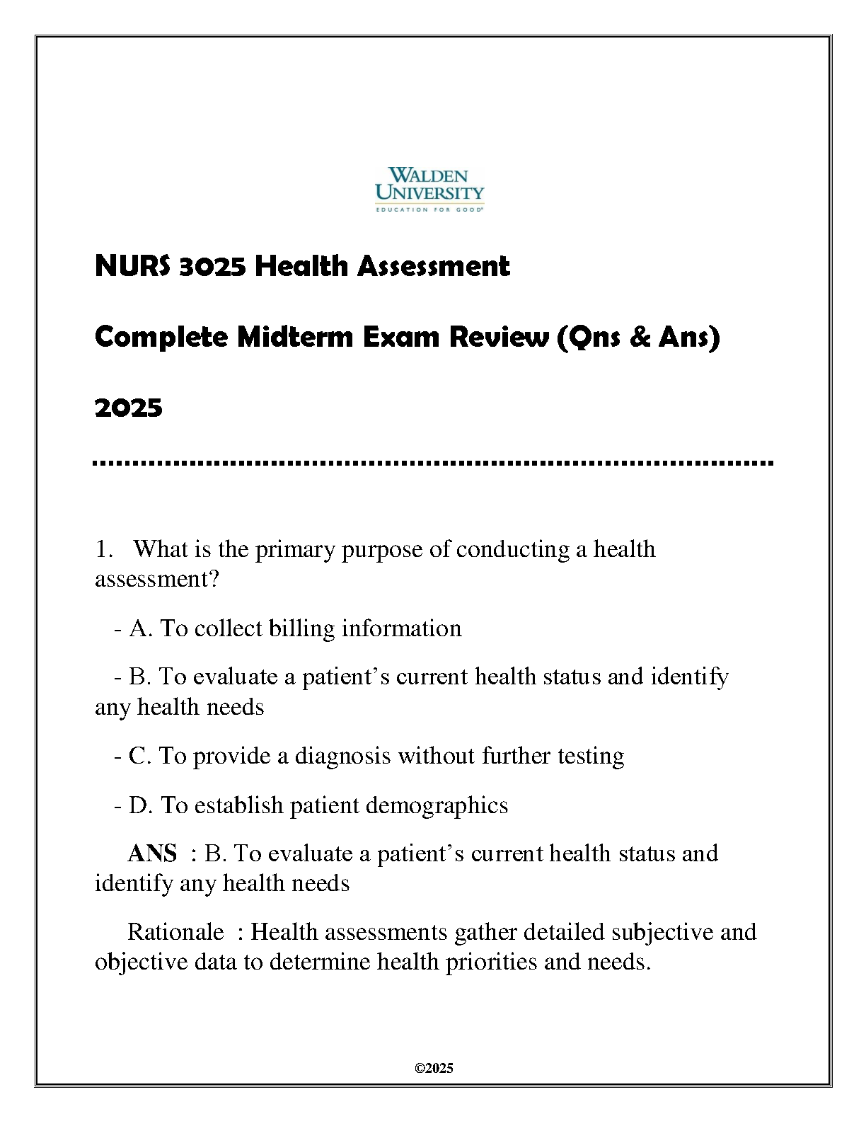 This comprehensive study guide provides a complete midterm exam review for NURS 3025 Health Assessment, covering key concepts and questions with detailed answers. Prepare effectively for your exam, understand core concepts, and improve your chances of passing on your first attempt. Specifically designed for the 2024/2025 academic year.