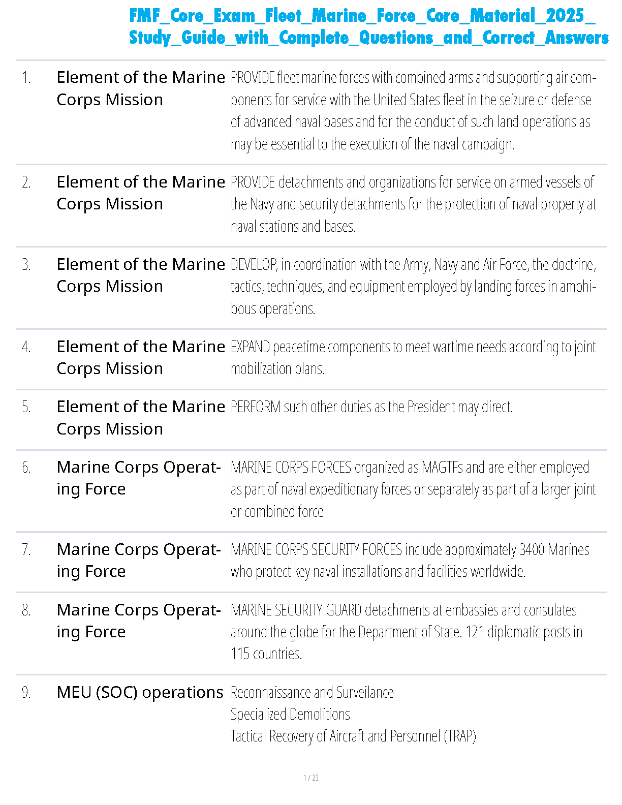 2025 FMF Core Exam Fleet Marine Force Study Guide with Complete Questions and Answers