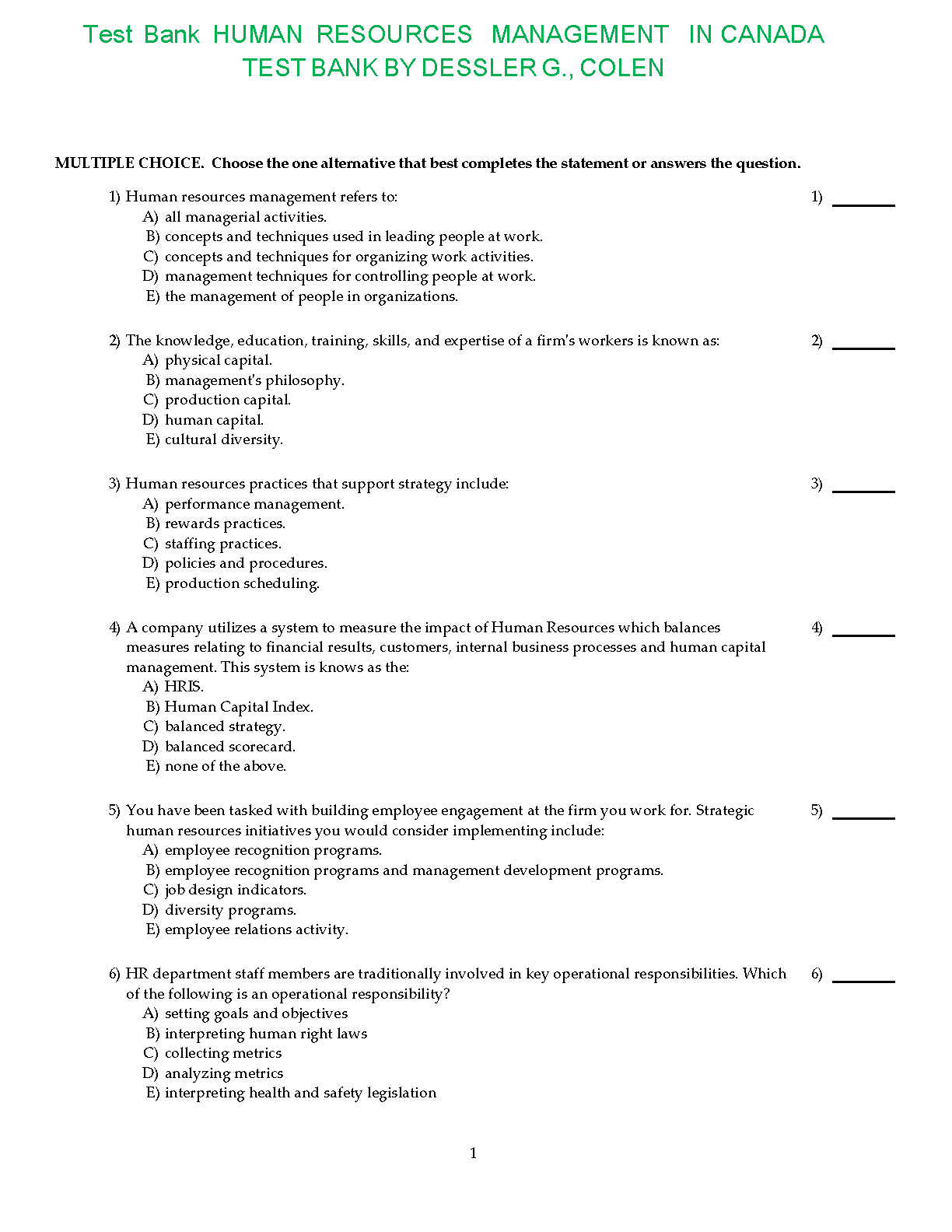 Human Resources Management in Canada Test Bank by Dessler G., Colen