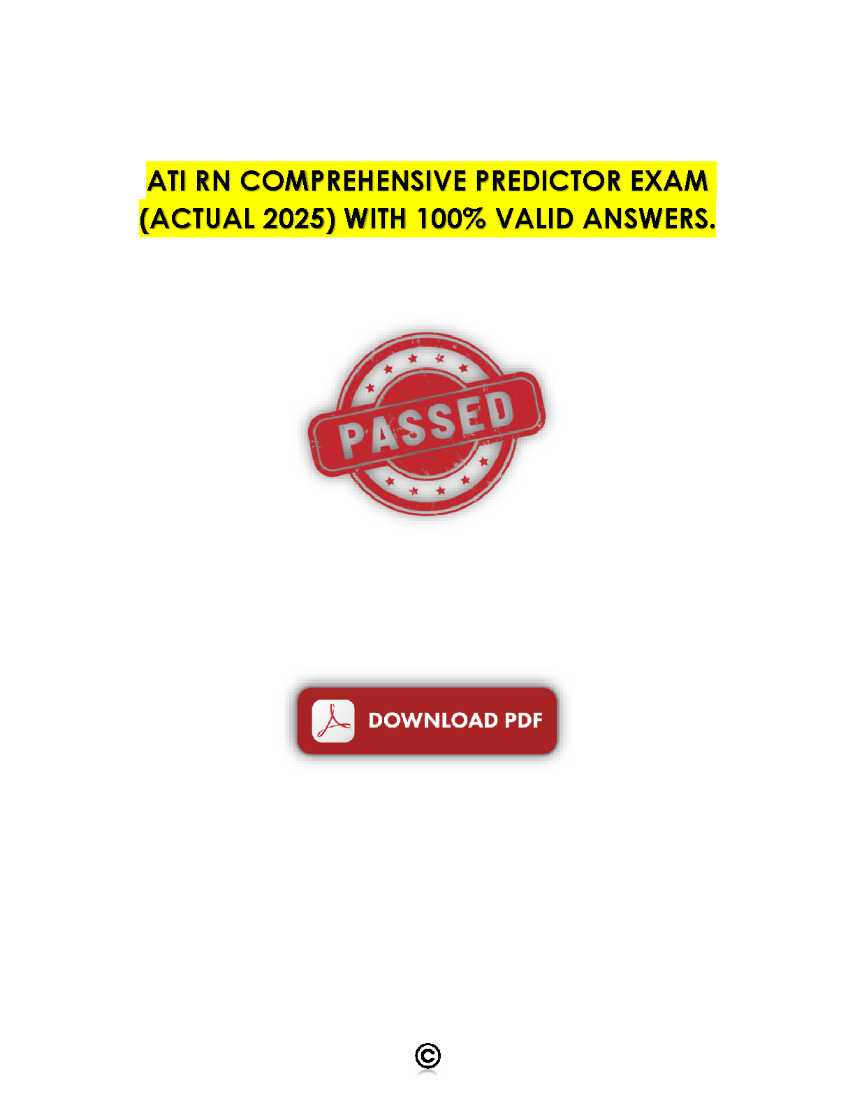 Ace your ATI RN Comprehensive Predictor exam with this 2025 edition study guide. This comprehensive resource includes 100% valid answers to help you succeed on your first try and avoid costly resits. Prepare effectively and confidently, ensuring exam readiness.