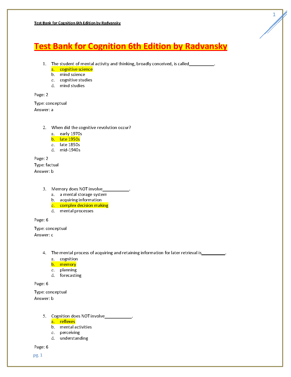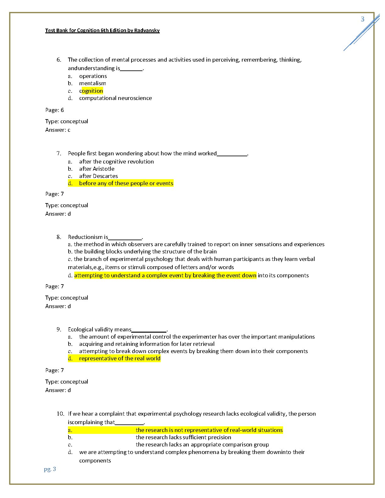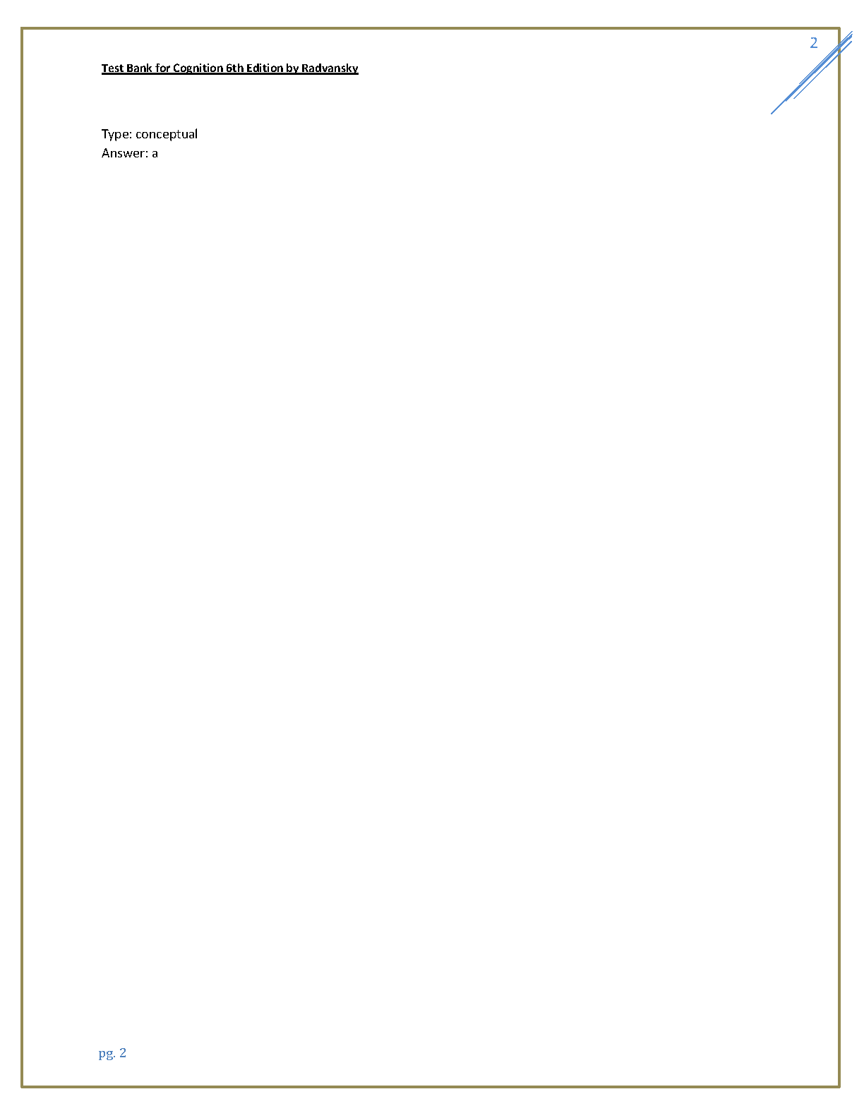 Test Bank for Cognition 6th Edition by Gabriel A. Radvansky