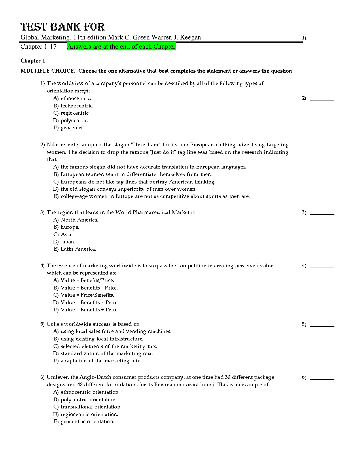 Ace your Global Marketing exams with this comprehensive test bank for the 11th edition by Mark C. Green and Warren J. Keegan. This resource provides a wealth of multiple-choice questions to help you master the key concepts and improve your exam performance, ensuring first-attempt success and avoiding resits. Prepare effectively and confidently for your 2024/2025 academic year exams.