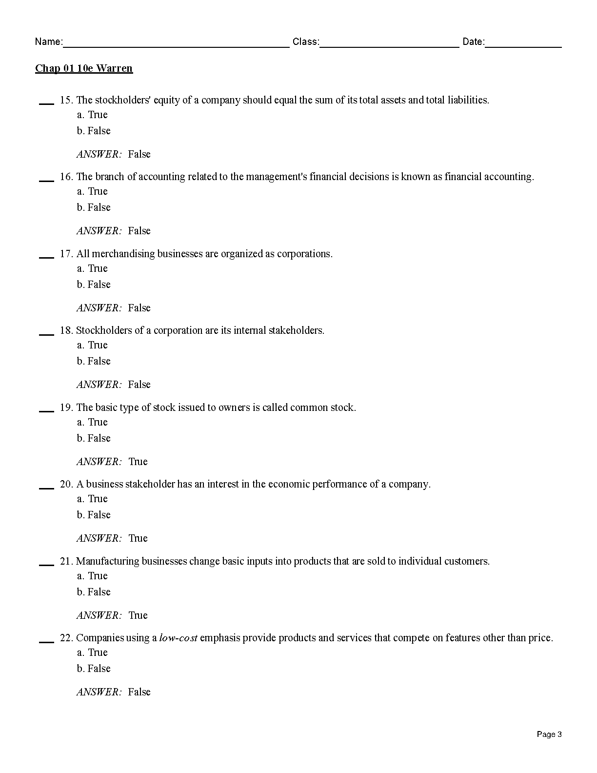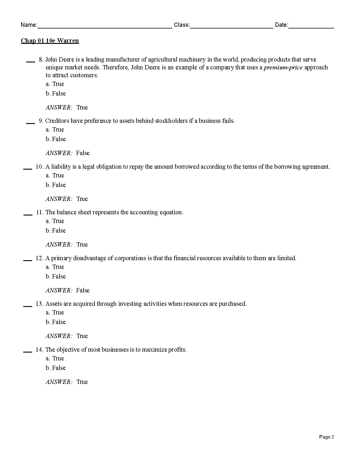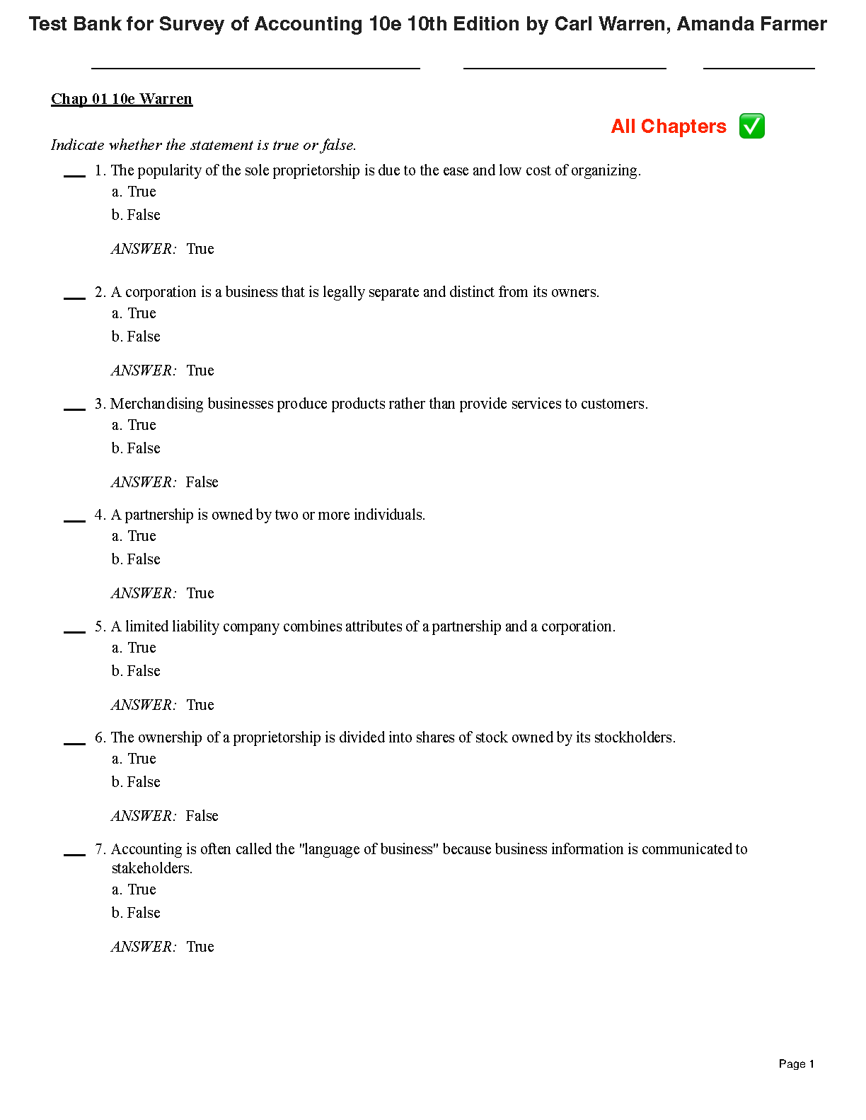 Survey of Accounting 10e 10th Edition Test Bank by Carl S. Warren, Amanda Farmer, and James M. Reeve