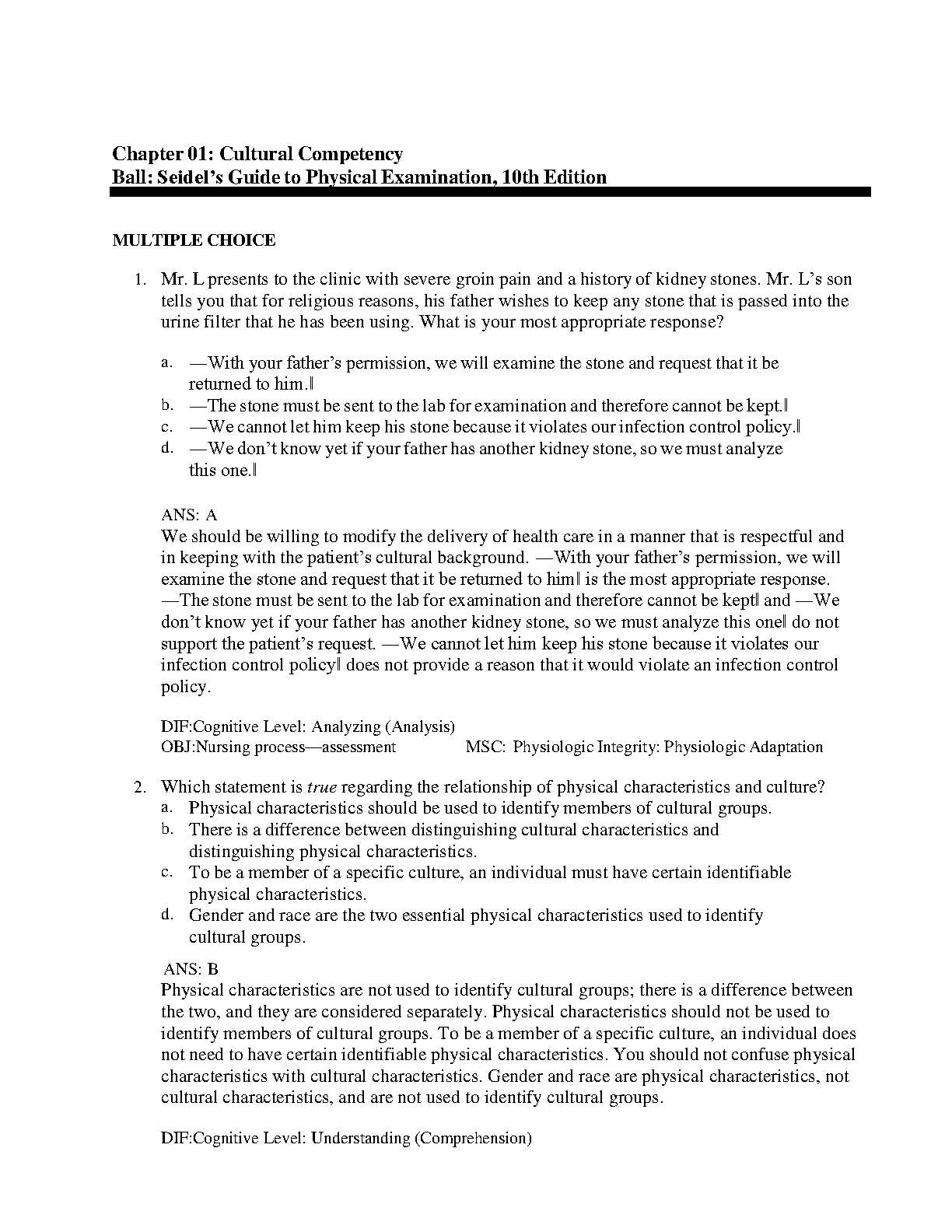 Ace your exams on the first attempt with this comprehensive test bank for Seidel's Guide to Physical Examination, 10th edition. This resource covers chapters 1-26, providing ample practice questions to ensure exam readiness. Written by Jane W. Ball, Joyce E. Dains, John A. Flynn, Barry S. Solomon, and Rosalyn W. Stewart.