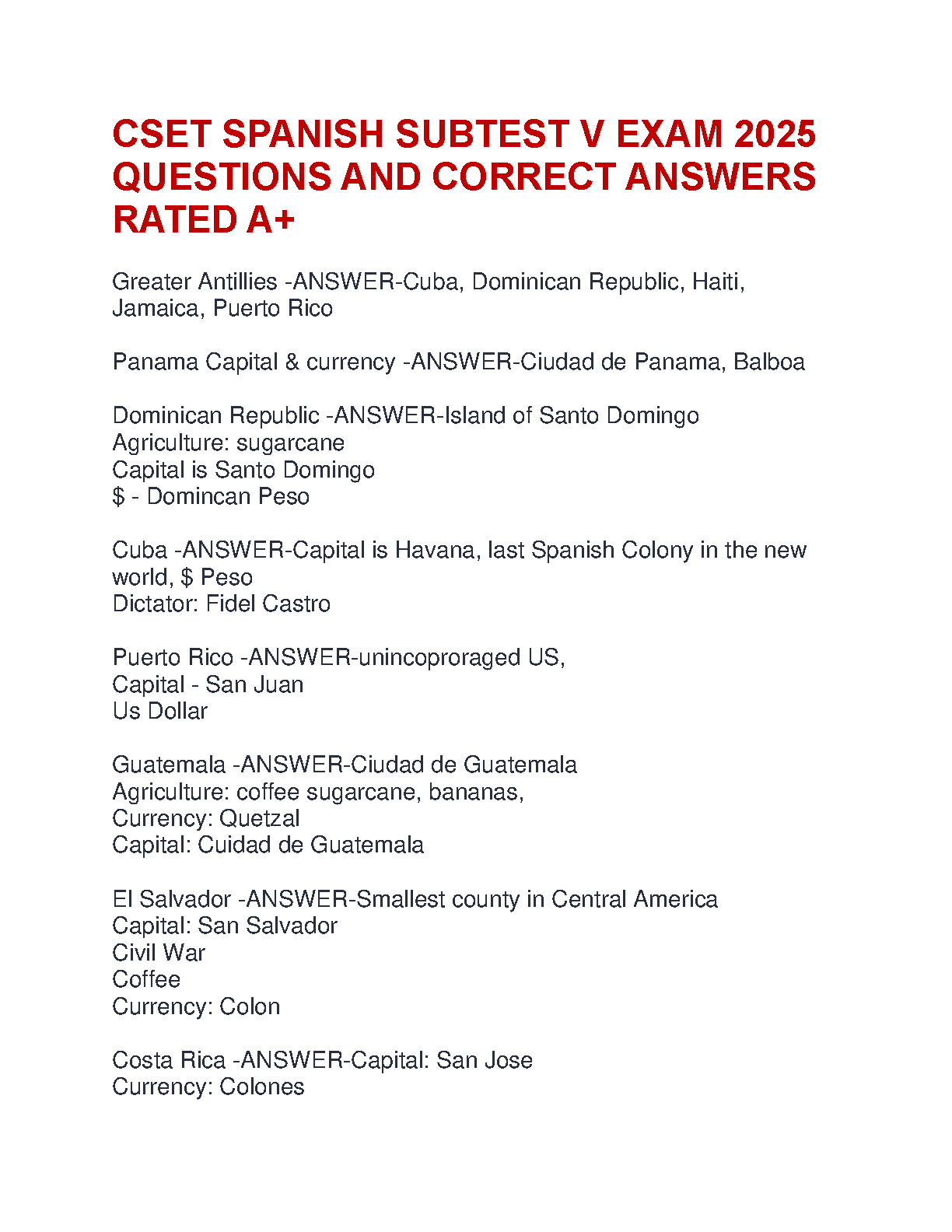 Ace the CSET Spanish Subtest V Exam in 2025 with this comprehensive guide featuring questions and answers rated A+. This resource covers key topics such as the Greater Antilles, Panama's capital and currency, the Dominican Republic, Cuba, Puerto Rico, Guatemala, and El Salvador, ensuring you're well-prepared for exam day.