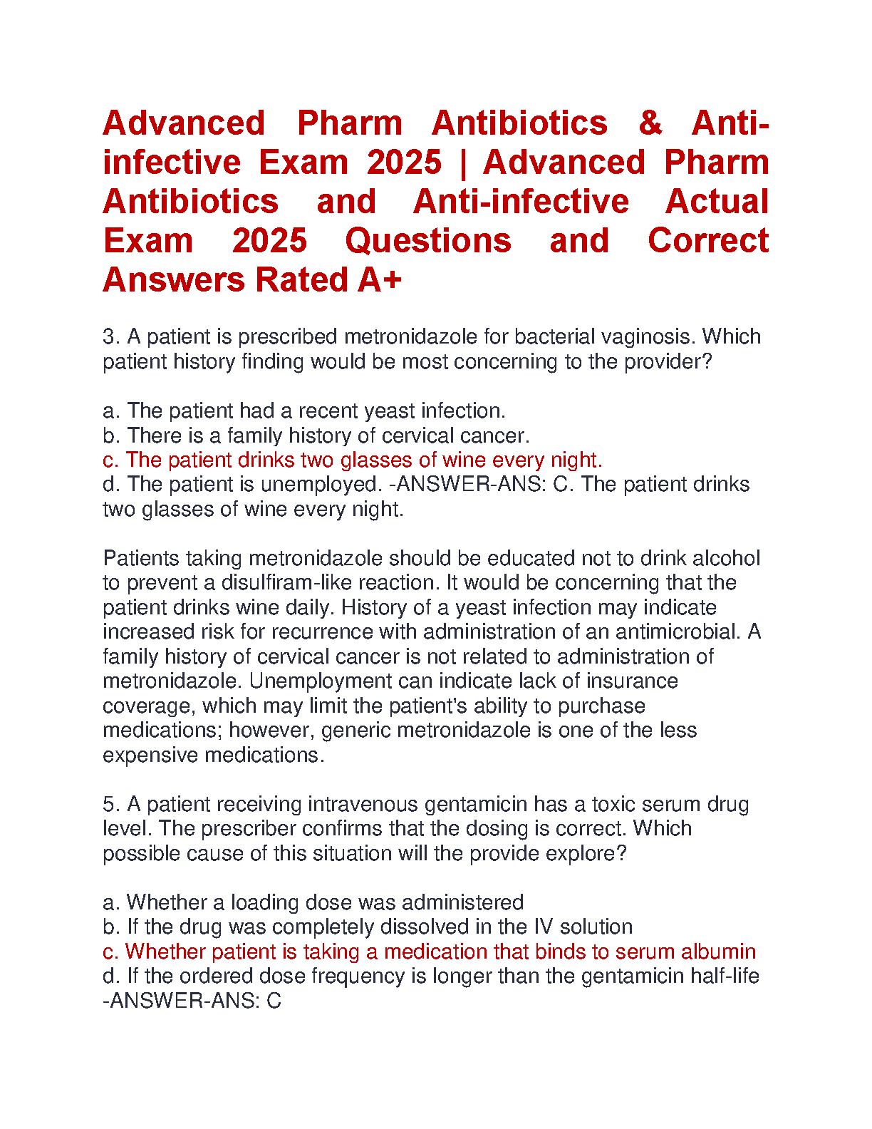 Ace your Advanced Pharm Antibiotics & Anti-infective Exam in 2025 with this comprehensive guide featuring actual exam questions and answers. This resource is designed to help students pass their exams on the first attempt, eliminating the need for resits. Get the edge you need to succeed!