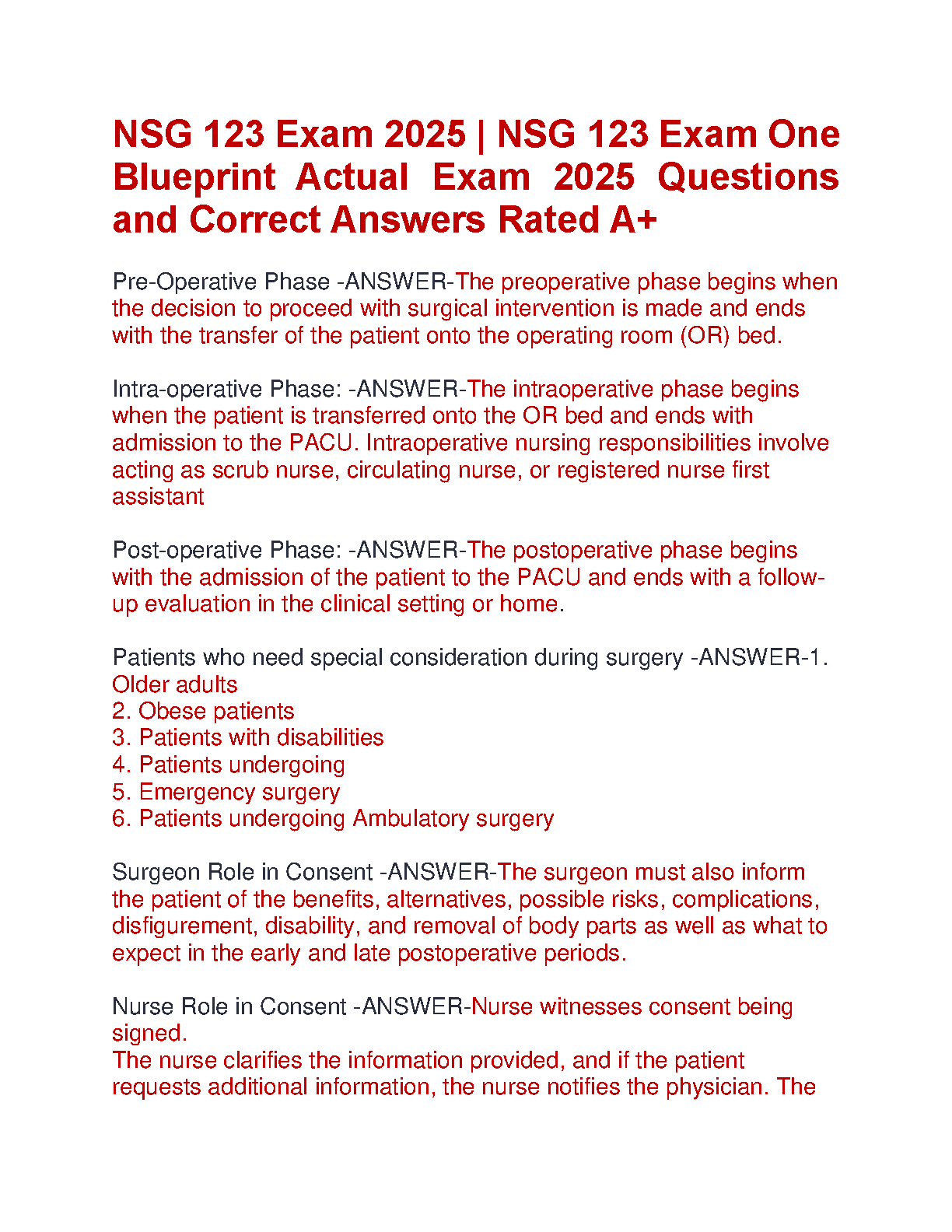 Ace your NSG 123 exam with this comprehensive blueprint of actual exam questions and answers for the 2025 academic year. This resource is designed to help nursing students achieve exam success on their first attempt and avoid resits. Covers preoperative, intraoperative, and postoperative phases, patient considerations, and the roles of surgeons and nurses in informed consent. Achieve an A+ with this expertly rated guide.