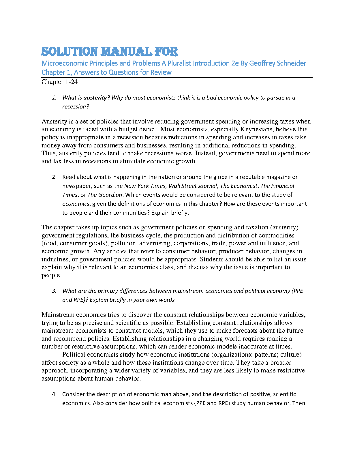 Solution Manual for Microeconomic Principles and Problems: A Pluralist Introduction, 2e by Geoffrey Schneider