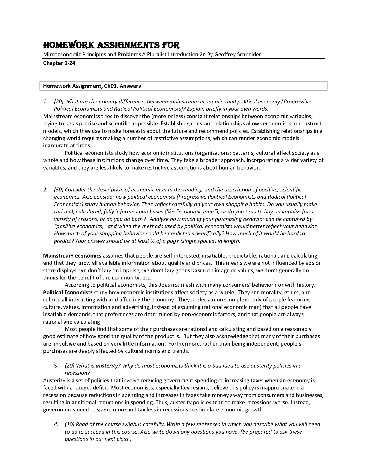 Microeconomic Principles and Problems: A Pluralist Introduction, 2nd Edition by Geoffrey Schneider - Homework Assignments and Solutions
