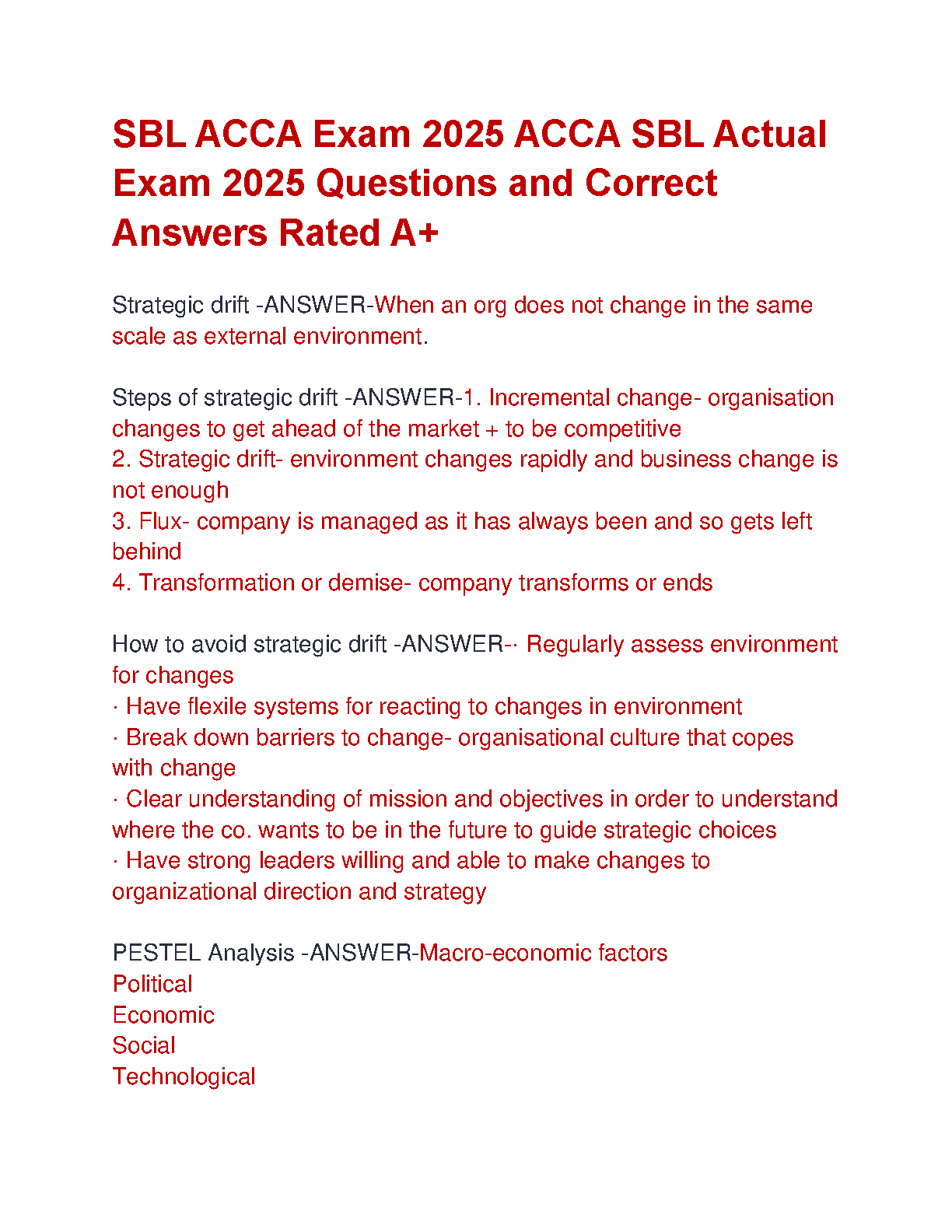 Ace your ACCA SBL Exam 2025 with this comprehensive guide containing actual exam questions and answers rated A+. This resource covers strategic drift, how to avoid it, and PESTEL analysis, equipping you with the knowledge needed to pass on your first attempt. Avoid resits and achieve exam success.