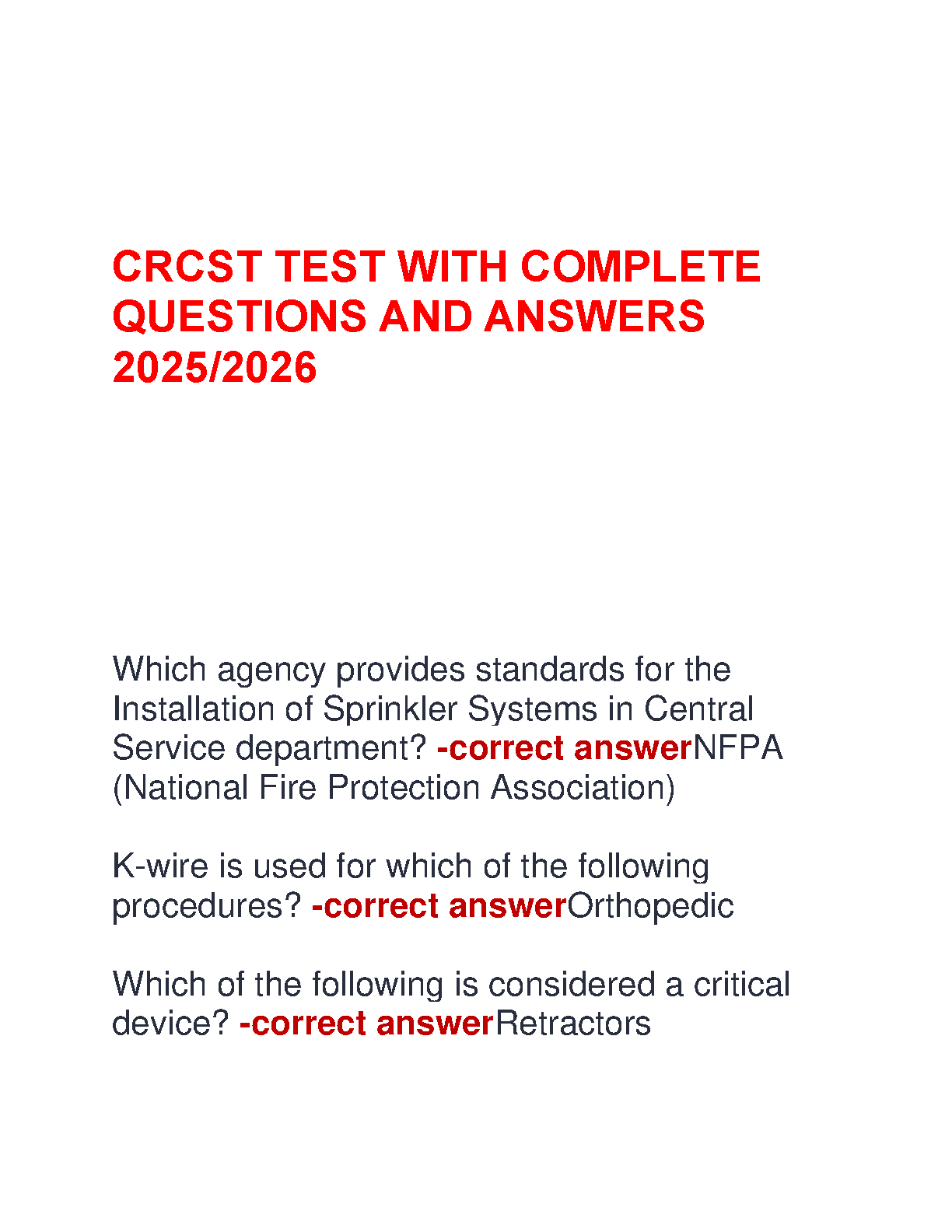 Ace your CRCST exam with this comprehensive question bank covering all key topics. Prepare effectively for the 2025/2026 exam and avoid resits. This resource provides complete questions and answers to help you master the material and pass with confidence.