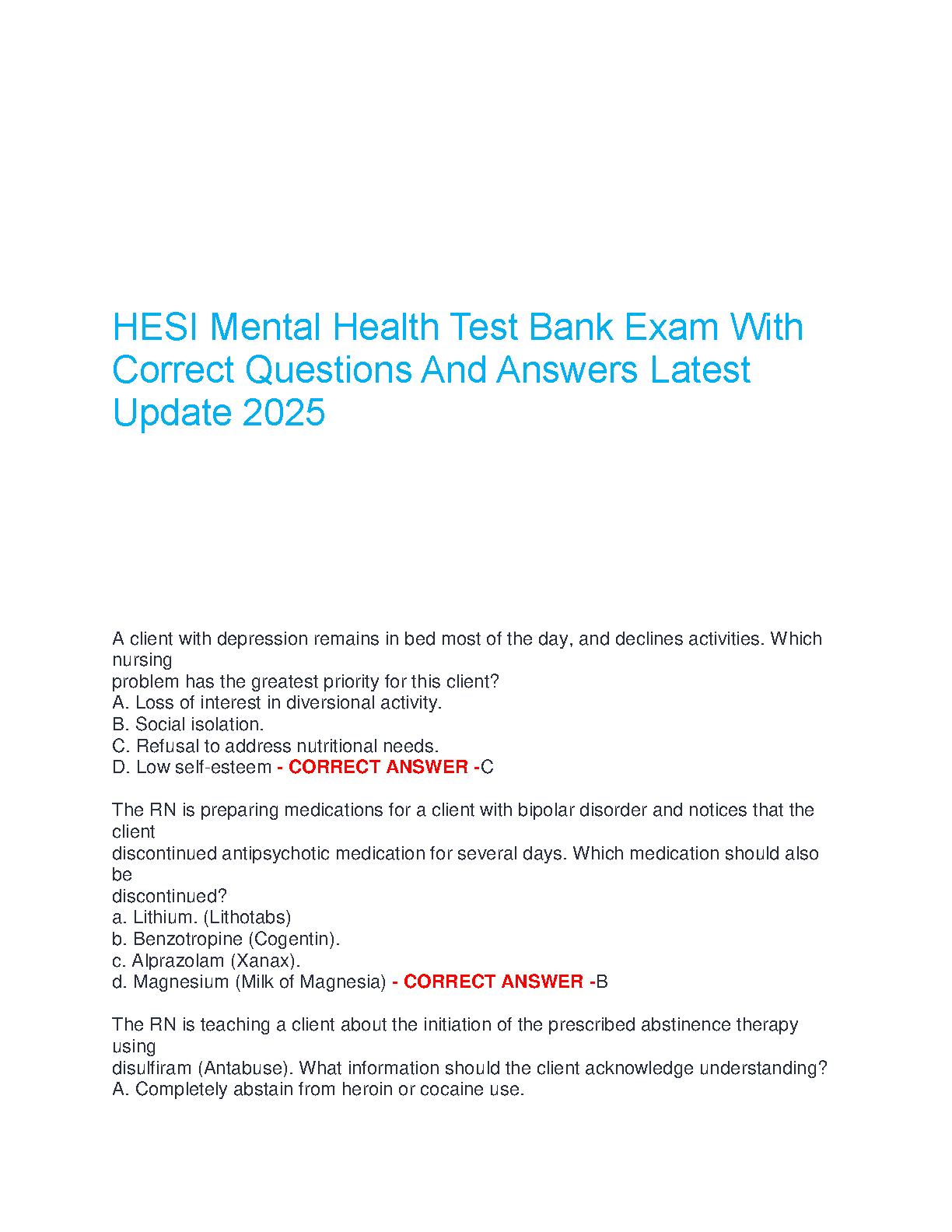 HESI Mental Health Test Bank Exam: 2025 Edition - Correct Questions and Answers for First-Attempt Exam Success
