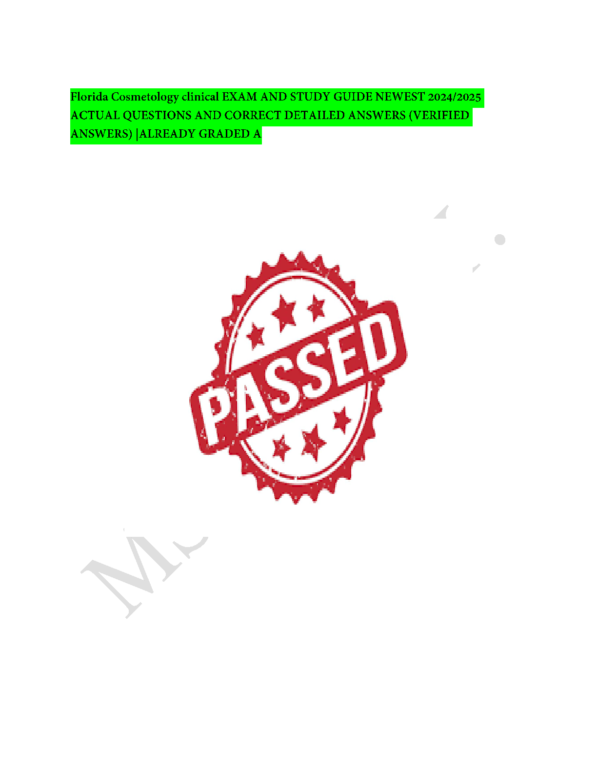 Pass the Florida Cosmetology clinical exam with confidence using this comprehensive study guide. This resource contains actual questions and detailed answers verified and graded for accuracy, ensuring you're well-prepared for exam day and avoid resits. Get ready to succeed in the 2024/2025 academic year!