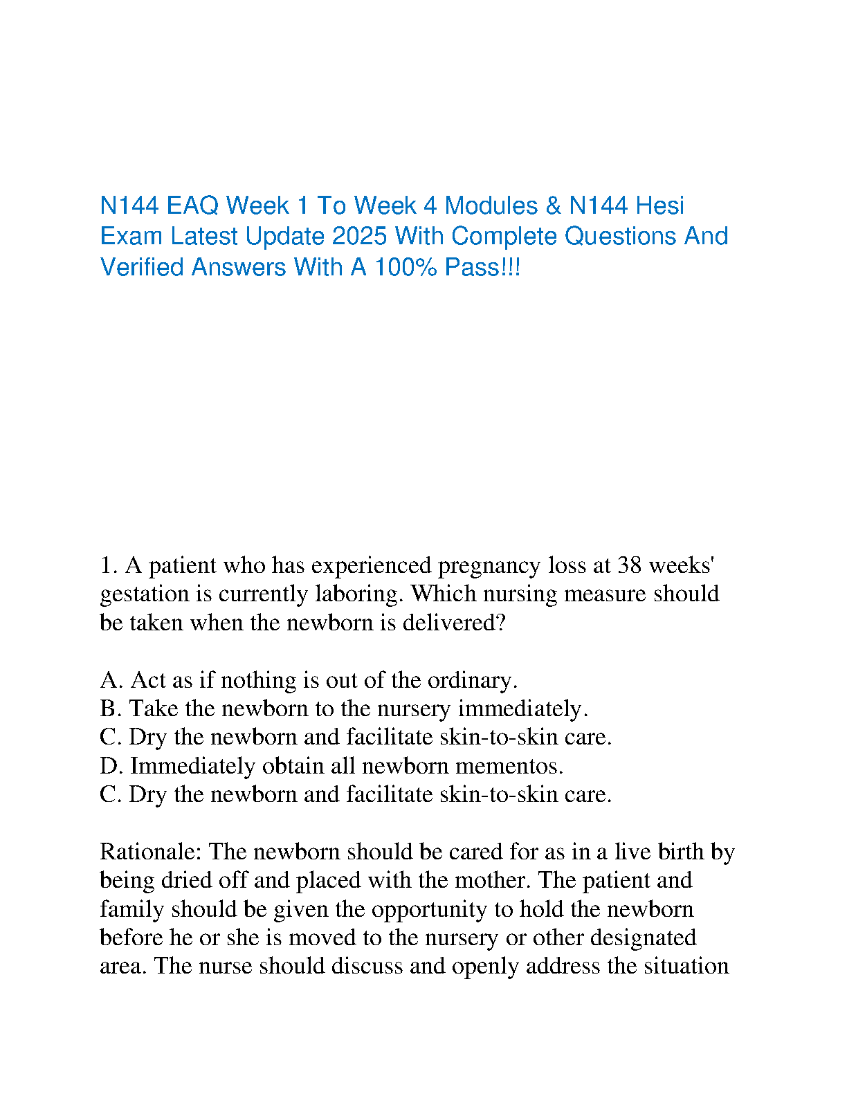 N144 EAQ Week 1-4 Modules & N144 HESI Exam: 2025 Latest Update with Complete Questions and Verified Answers for a 100% Pass Rate