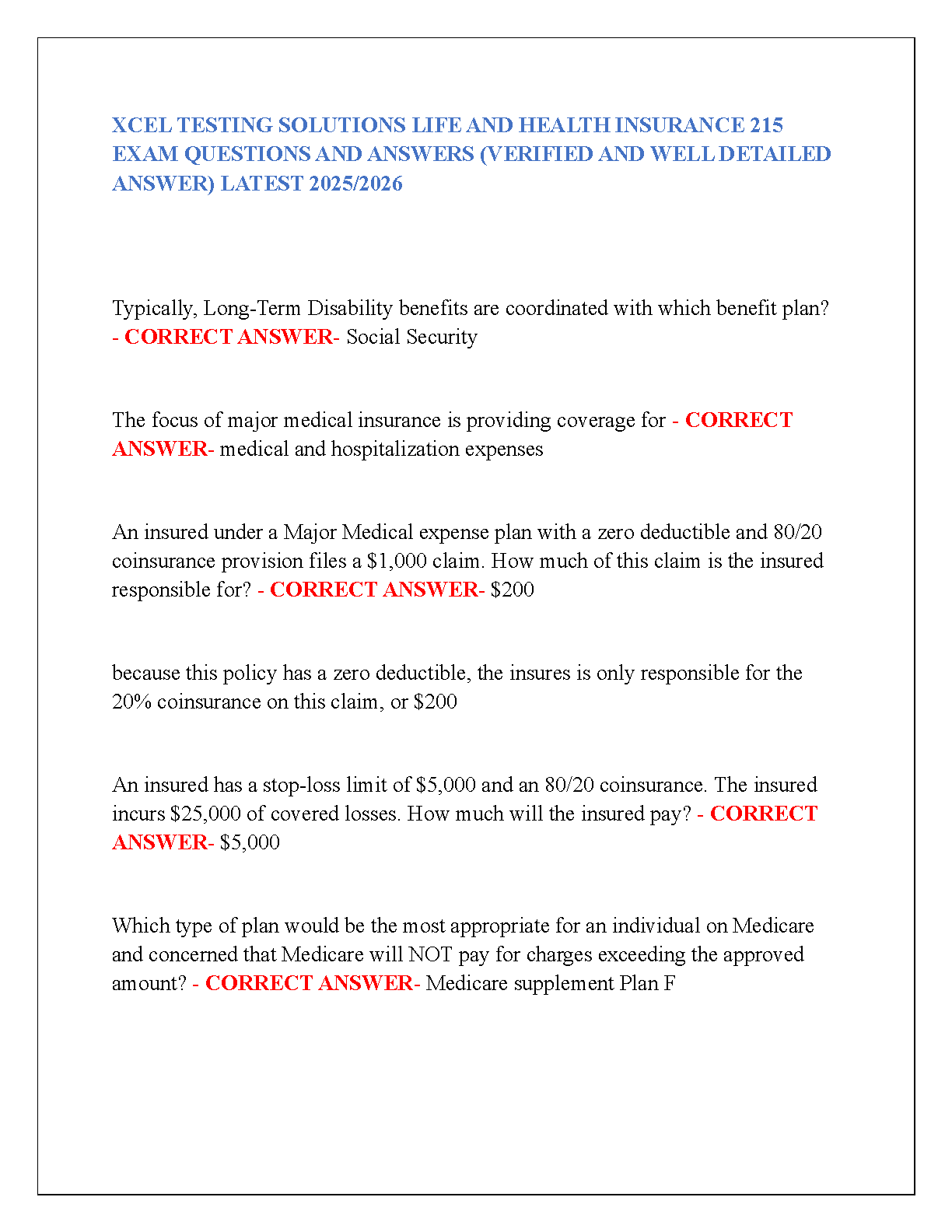 XCEL Testing Solutions: Life and Health Insurance 215 Exam Questions and Answers (2025/2026 Edition)