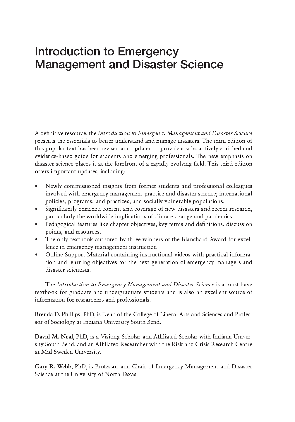 Introduction to Emergency Management and Disaster Science, 3rd Edition by Brenda D. Phillips, David M. Neal, and Gary R. Webb