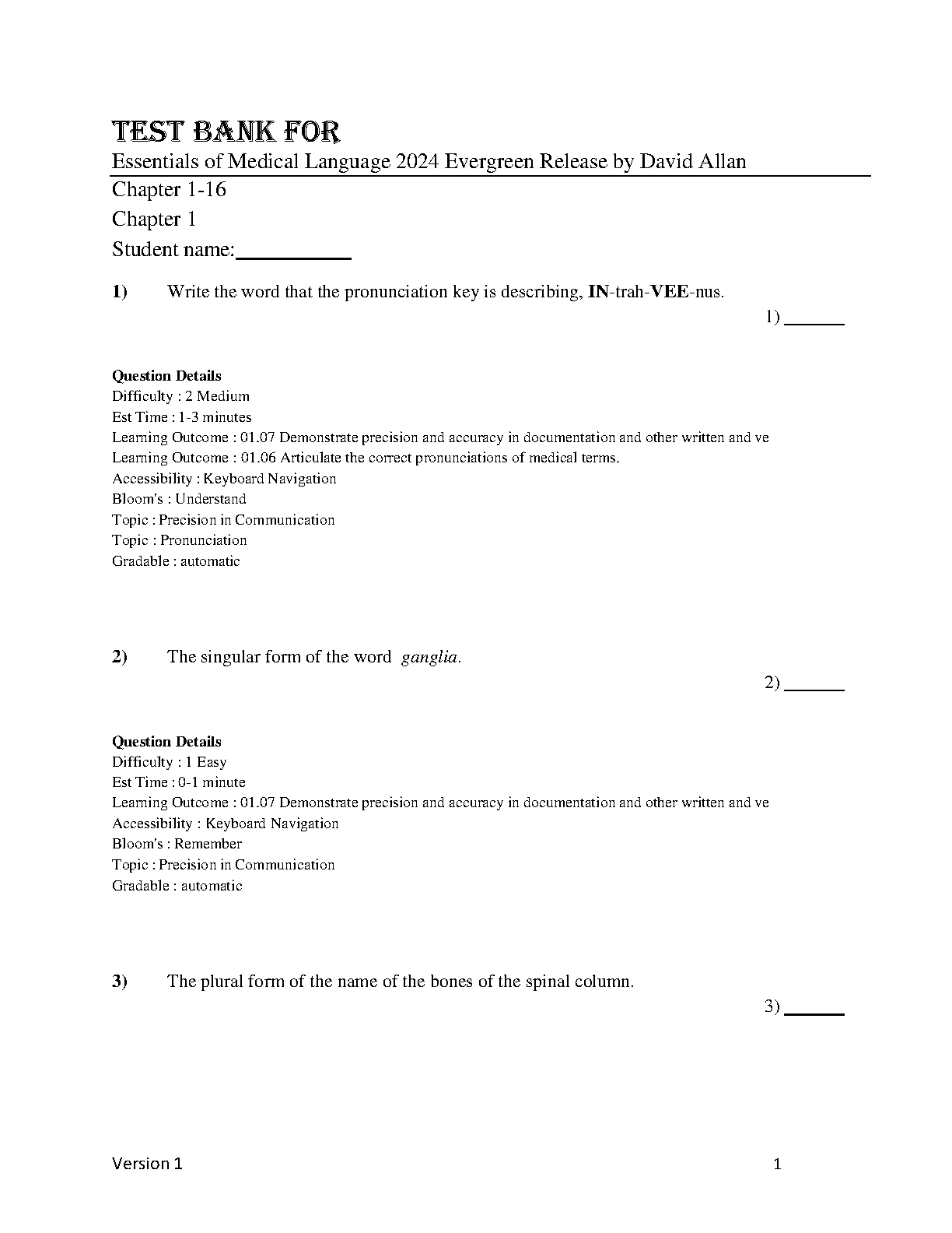 Ace your Essentials of Medical Language exams with this comprehensive test bank. This resource, based on the 2024 Evergreen release by David Allan, provides practice questions designed to help students master key concepts and achieve exam success on their first try, avoiding resits. Prepare effectively and confidently for your medical terminology assessments.