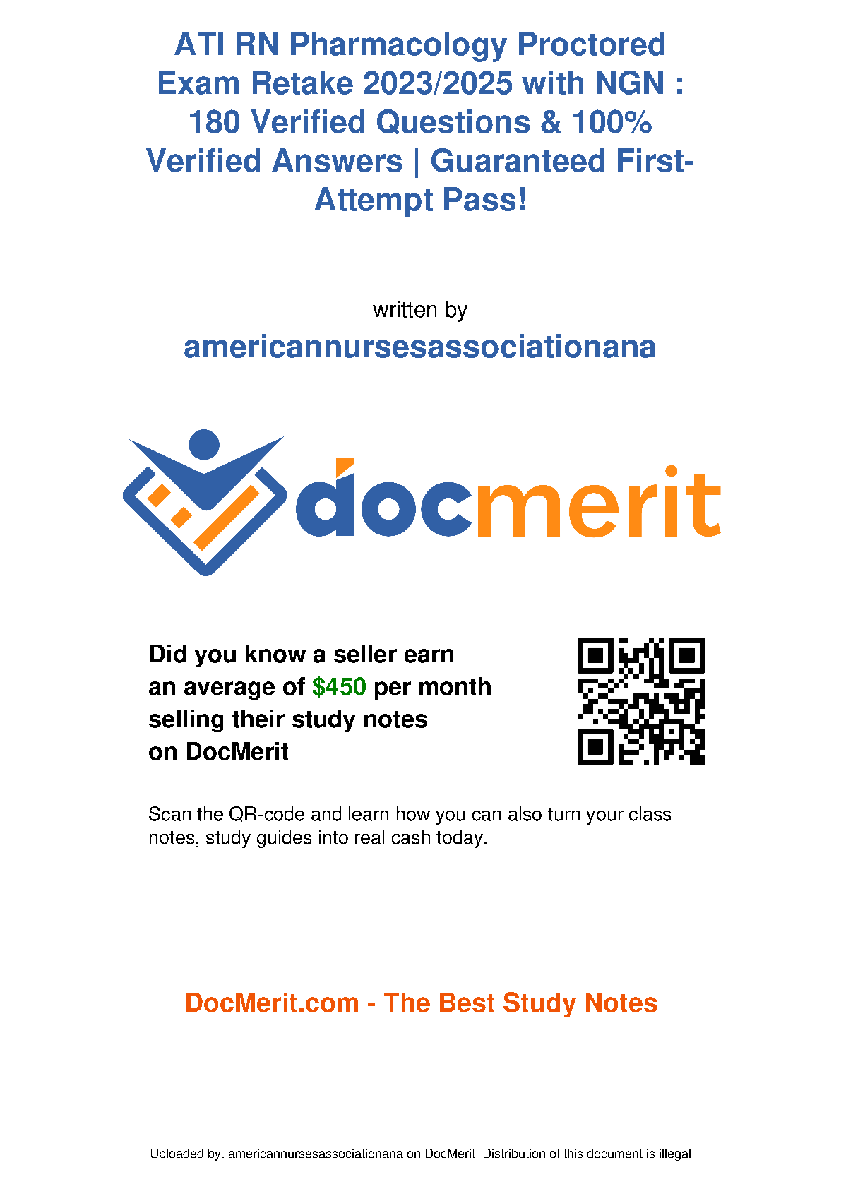 ATI RN Pharmacology Proctored Exam Retake 2023/2025 by American Nurses Association: 180 Verified Questions & Answers for Guaranteed First-Attempt Pass!