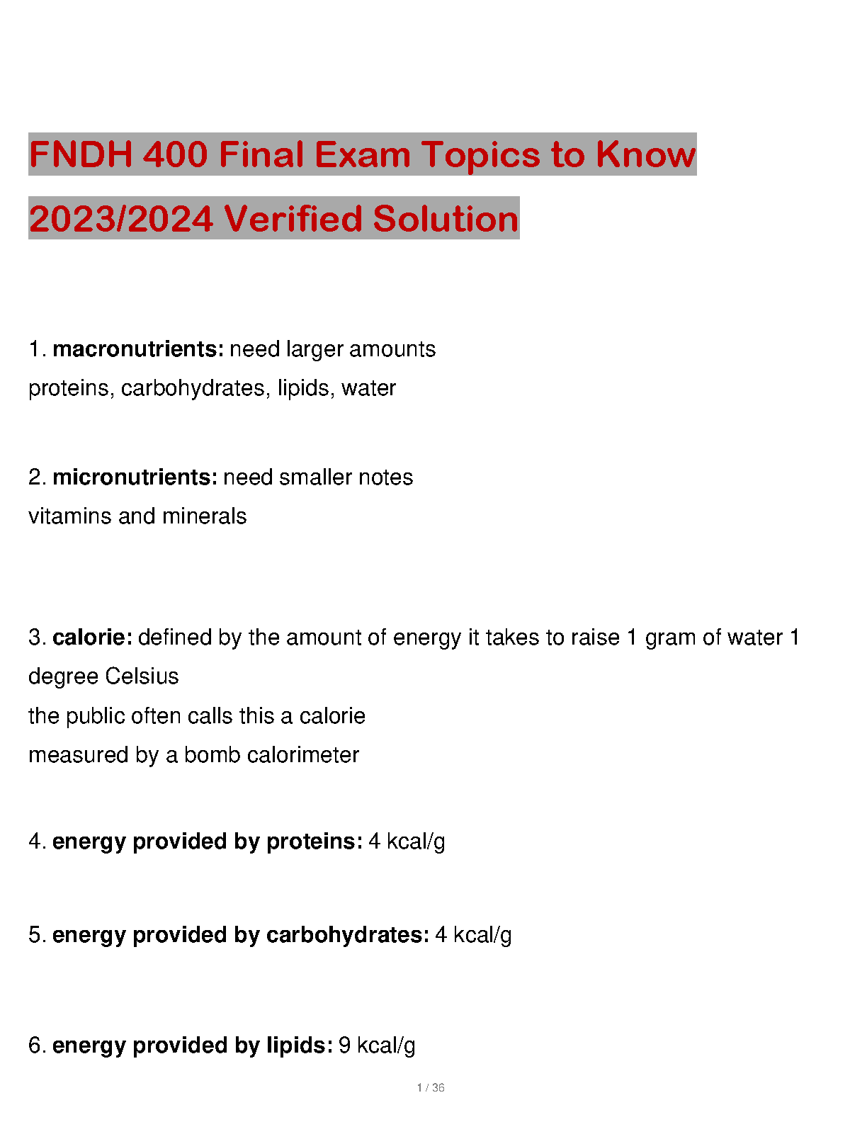 Ace your FNDH 400 final exam with this comprehensive guide covering key topics like macronutrients, micronutrients, calorie calculations, and energy provided by proteins, carbohydrates, and lipids. This verified solution ensures exam success on your first attempt, saving you time and effort.