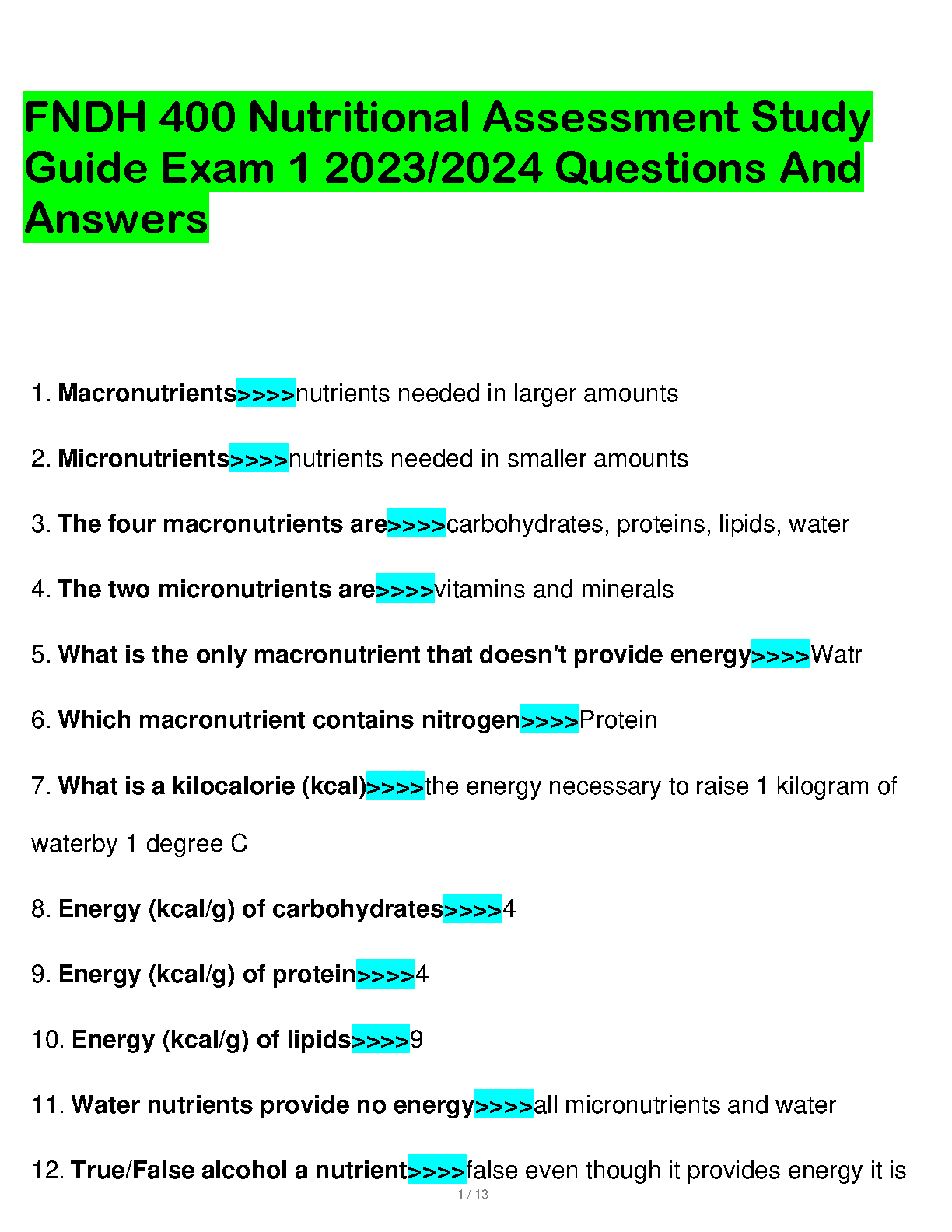 Ace your FNDH 400 Nutritional Assessment Exam with this comprehensive study guide covering key concepts, practice questions, and answers for the 2023/2024 academic year. Master macronutrients, micronutrients, and energy calculations to achieve exam success on your first attempt.