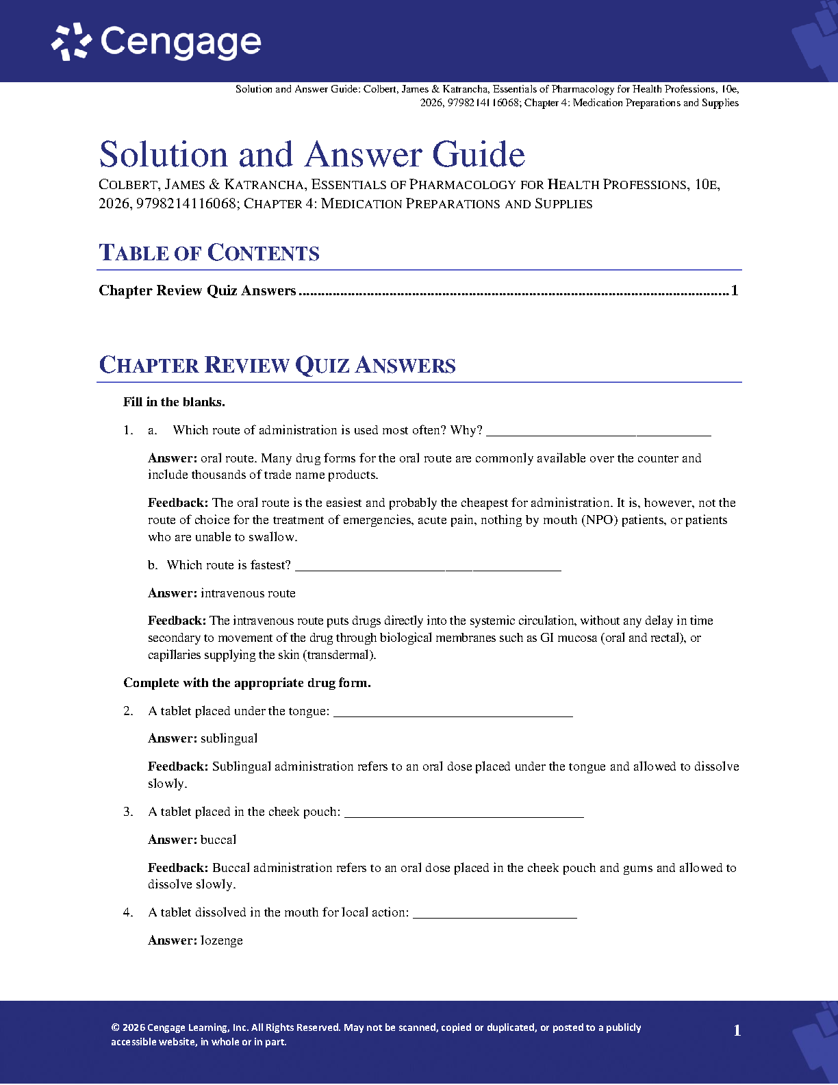 Ace your Pharmacology exams with this comprehensive solution and answer guide for Colbert, James & Katrancha's Essentials of Pharmacology for Health Professions, 10th edition. This resource provides detailed answers and explanations to chapter review quizzes, ensuring a thorough understanding of key concepts and improving your chances of passing on the first attempt. Perfect for students aiming to avoid resits in the 2024/2025 academic year.