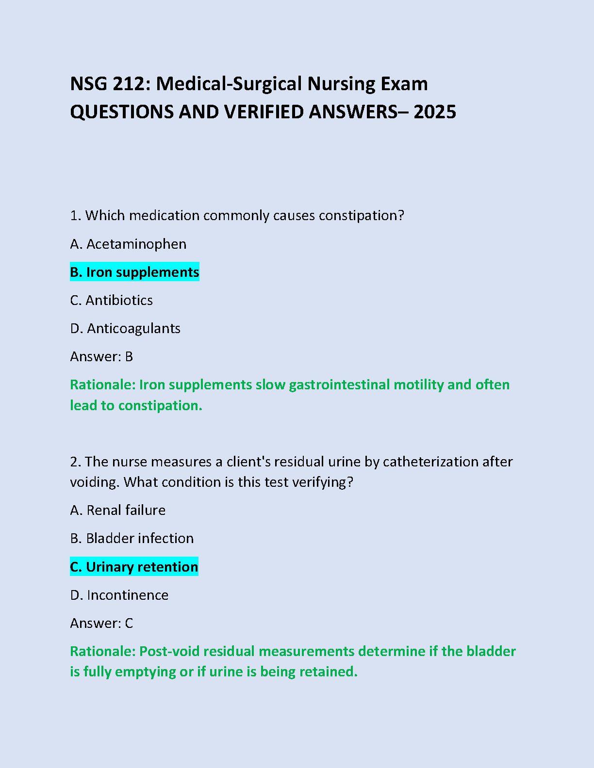Pass your NSG 212 Medical-Surgical Nursing exam with flying colors using this comprehensive study guide, featuring verified answers and rationales. Designed to help you ace your exams on your first try and avoid resits.