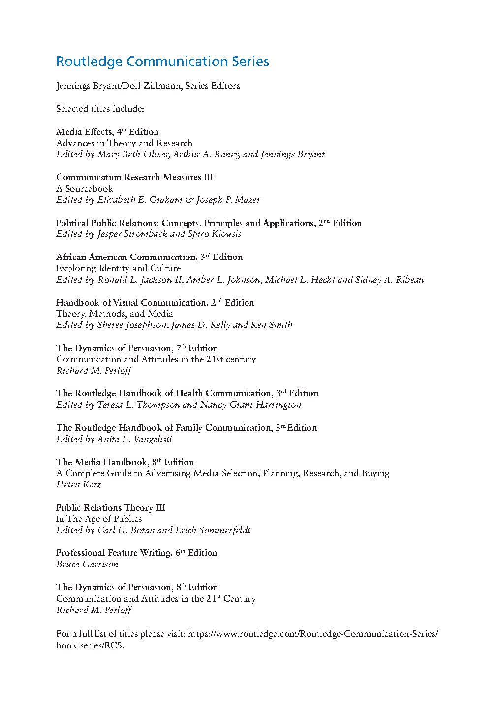 Ace your persuasion courses with the 8th edition of Richard M. Perloff's 'The Dynamics of Persuasion'. This comprehensive textbook provides an accessible and detailed exploration of persuasion's theoretical underpinnings, enhanced with contemporary examples and new scholarship on misinformation, health communication, and societal issues. Prepare for exams confidently with its classic terms and modern approaches, supplemented by online resources including an instructor manual, lecture slides, and a testbank.