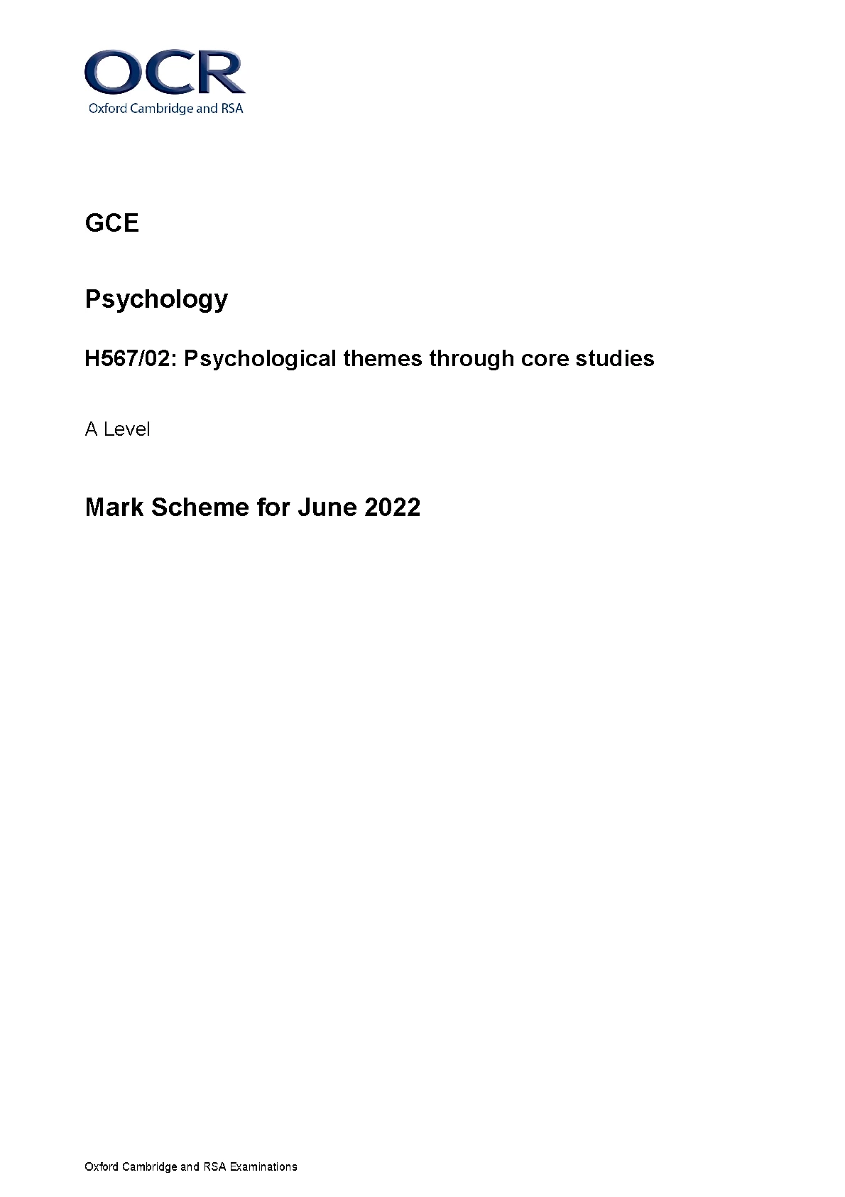 OCR A LEVEL PSYCHOLOGY PAPER 2 JUNE 2022 MARK SCHEME (H567/02: Psychological themes through core studies). DOWNLOAD OFFICIAL AND VERIFIED OCR A LEVEL PSYCHOLOGY PAPER 2 JUNE 2022 on Hackedexams.com INSTANTLY.