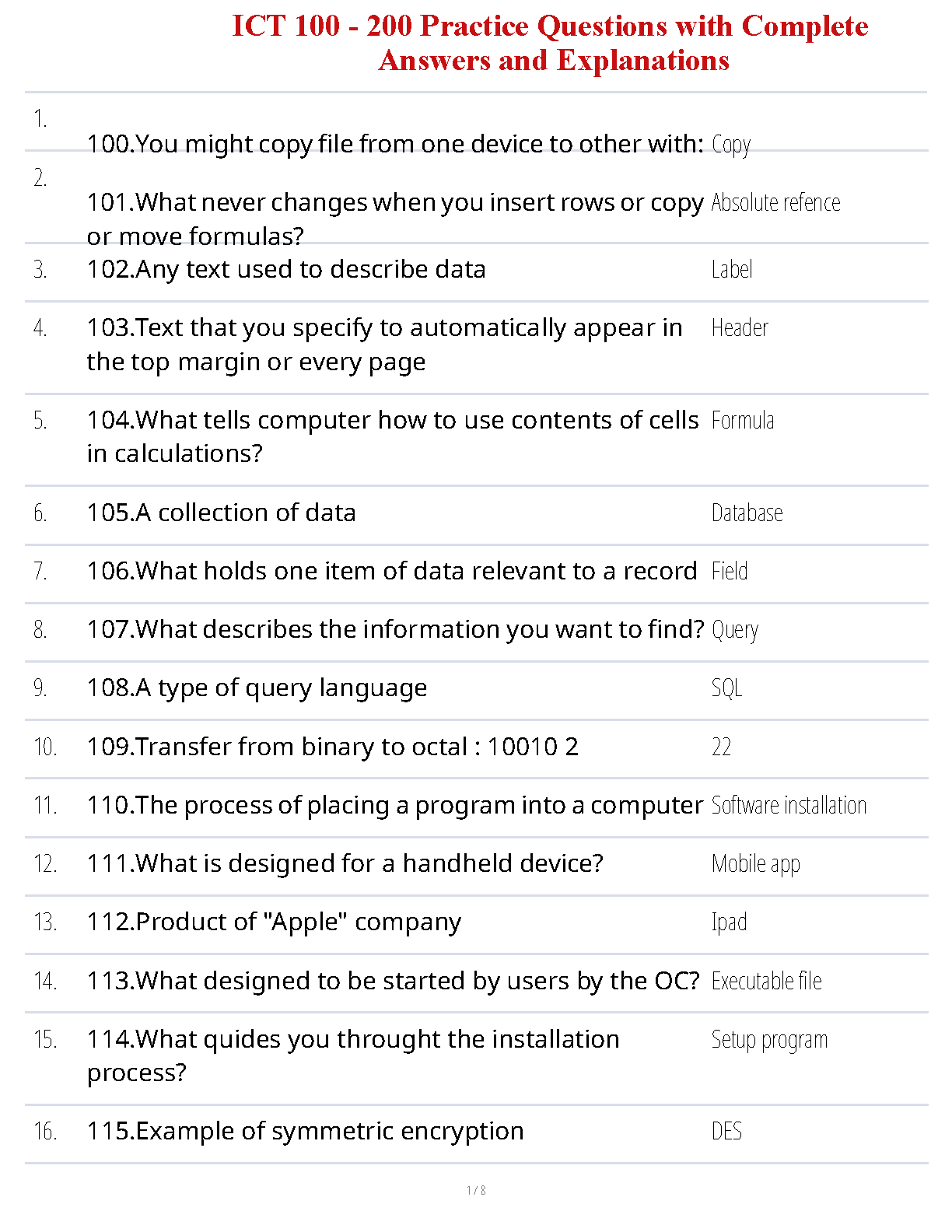 ICT 100 - 200 Practice Questions with Complete Answers and Explanations: Ace Your Exams!