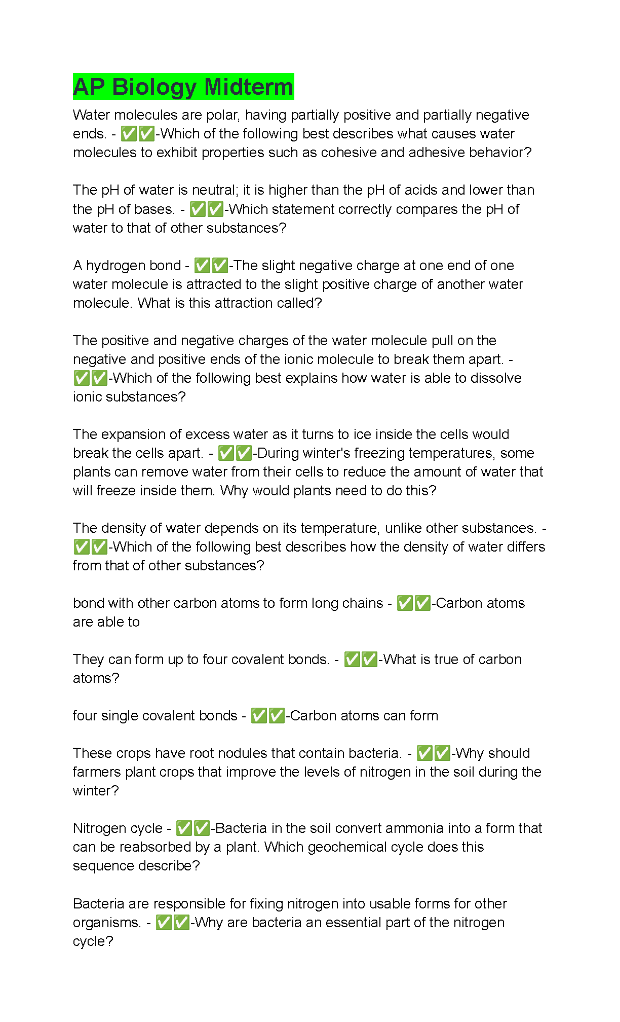 Prepare for your AP Biology midterm exam with confidence! This comprehensive study guide covers key concepts, including water properties, pH, hydrogen bonds, ionic substances, density, carbon atoms, and the nitrogen cycle. Designed to help you understand the material and pass your exam on the first try, avoiding resits.