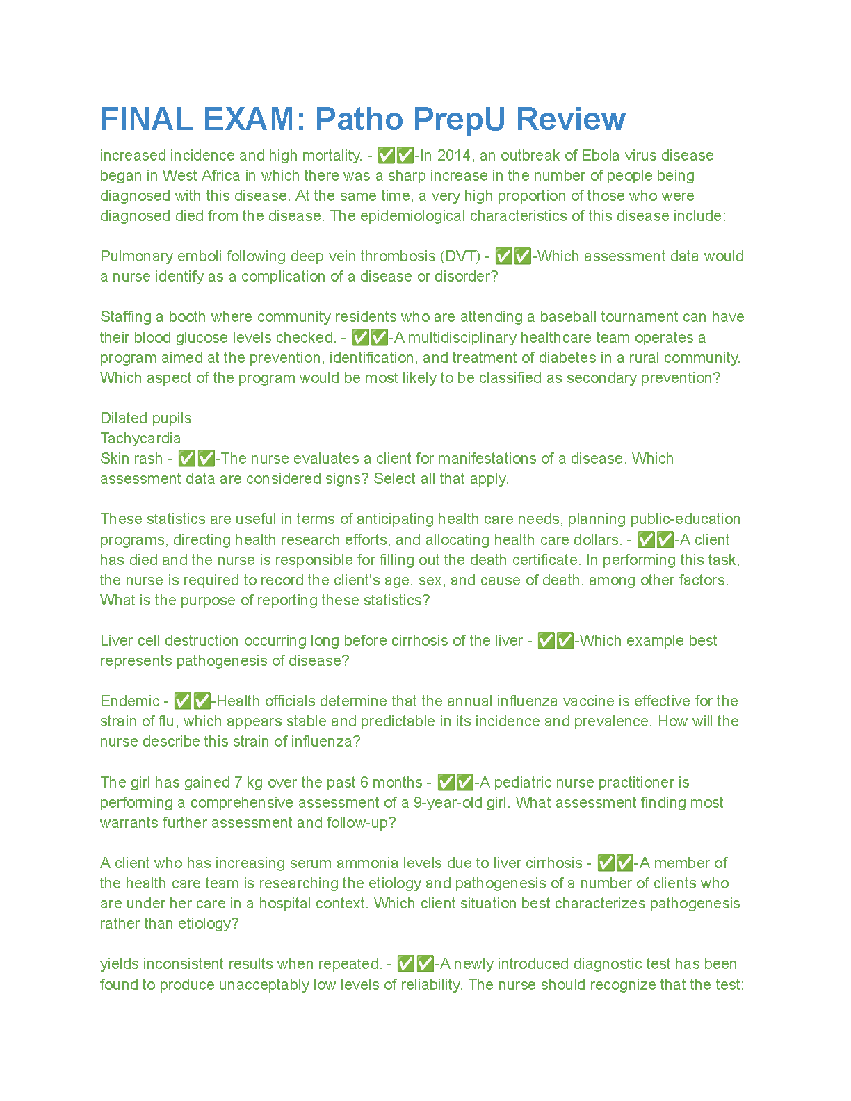 Ace your Patho PrepU final exam with this comprehensive guide. This resource provides a detailed review of key concepts and practice questions to help students master the material and achieve exam success on their first attempt. Prepare effectively and avoid resits!